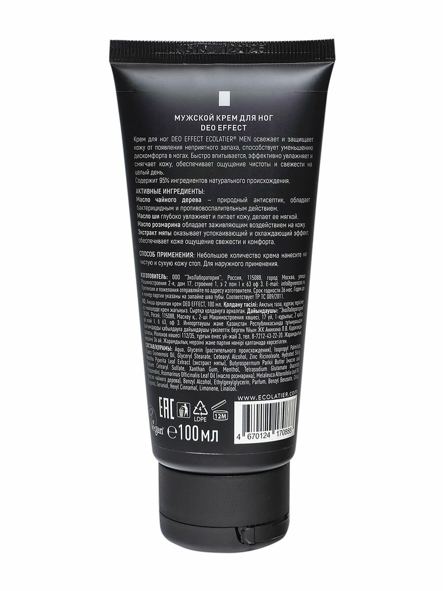 | Дополнительная информация | "Крем для ног DEO EFFECT ECOLATIER® MEN освежает и защищает кожу от появления неприятного запаха, способствует уменьшению дискомфорта в ногах. Быстро впитывается, эффективно увлажняет и смягчает кожу, обеспечивает ощущение чистоты и свежести на целый день. Содержит 95% ингредиентов натурального происхождения. Масло чайного дерева — природный антисептик, обладает бактерицидным и противовоспалительным действием. Масло ши глубоко увлажняет и питает кожу, делает ее мягкой. Масло розмарина обладает заживляющим воздействием на кожу. Экстракт мяты оказывает успокаивающий и охлаждающий эффект, обеспечивает коже ощущение свежести и комфорта." |