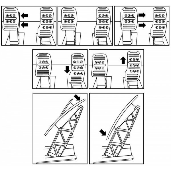 | Минусы: | Отверстия для крепления на кокпит расположены на одной лини, как результат - при модификации педали тормоза сильно качаются на болтах, приходится прижимать планкой подставку под пятки. При калибровке потенциометры приобретают мёртвую зону в начале и конце хода, драйвер не позволяет устранить проблему. |