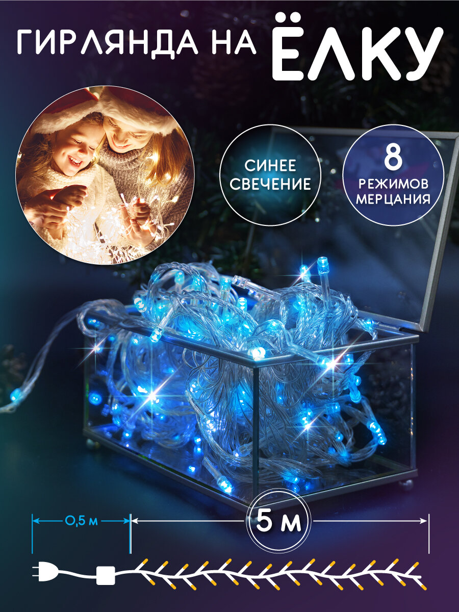Новогодняя гирлянда на елку от сети, 5 м / Синяя гирлянда новогодняя на елку / Гирлянда светодиодная / Гирлянда на шторы, на окна / Гирлянда от сети