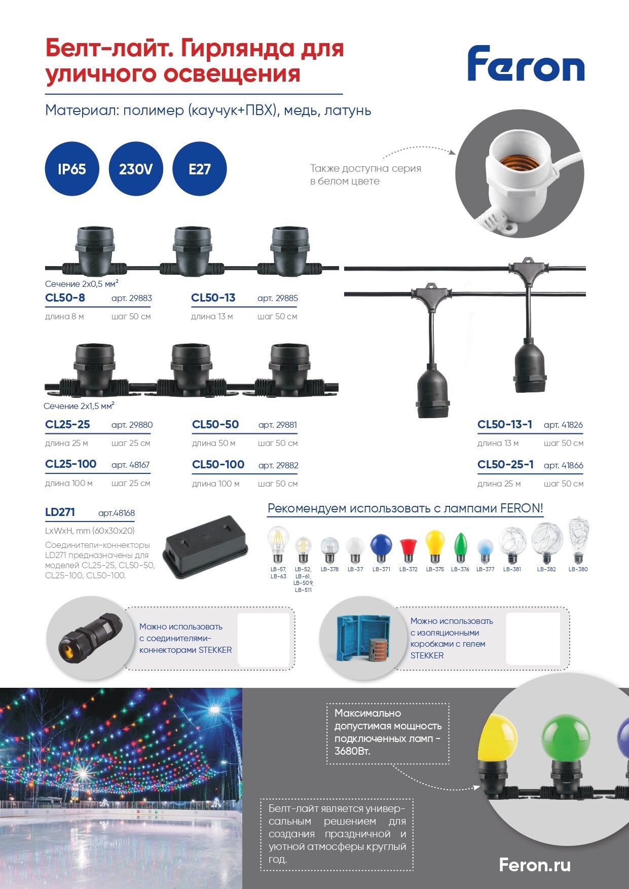 Гирлянда 230V, 20 патронов, E27 белый, шаг 50cm, IP 65, 13м +3м сетевой шнур, CL50-13, Feron Белт-лайт,29886