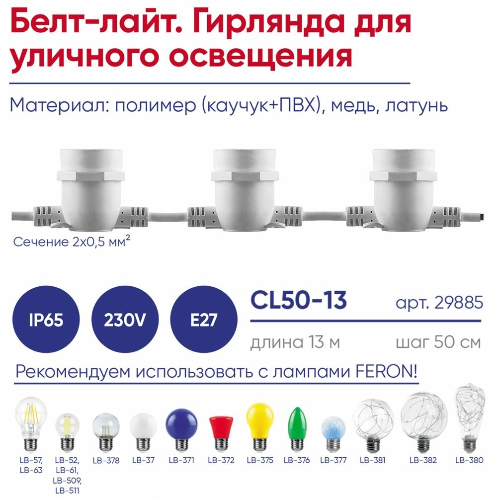 Гирлянда 230V, 20 патронов, E27 белый, шаг 50cm, IP 65, 13м +3м сетевой шнур, CL50-13, Feron Белт-лайт,29886