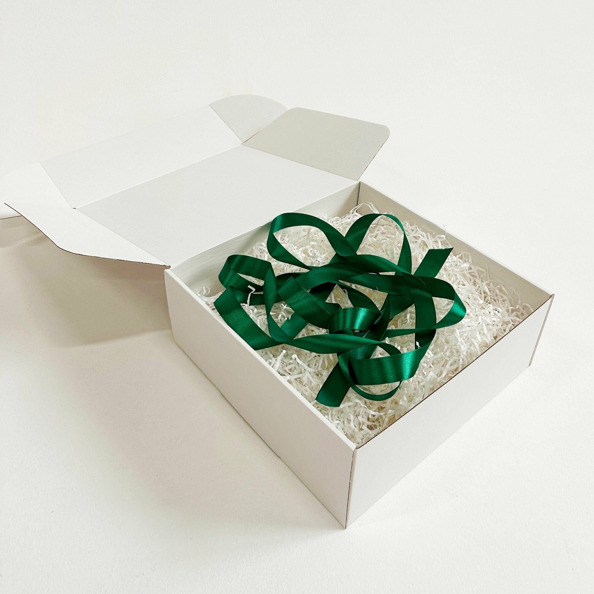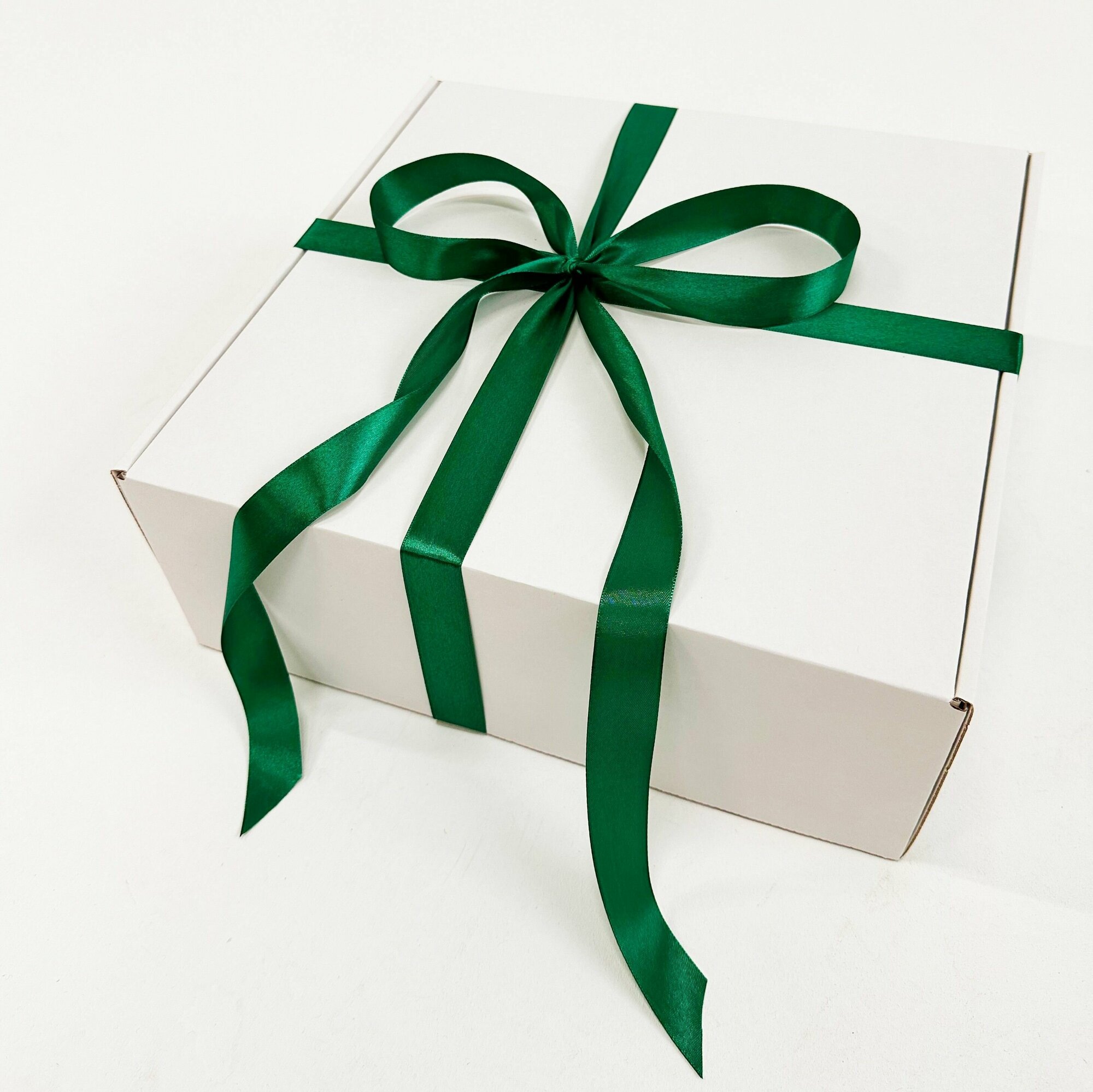 Купить Белая подарочная коробка GILEV 32x32x12см с зеленой лентой и наполнителем