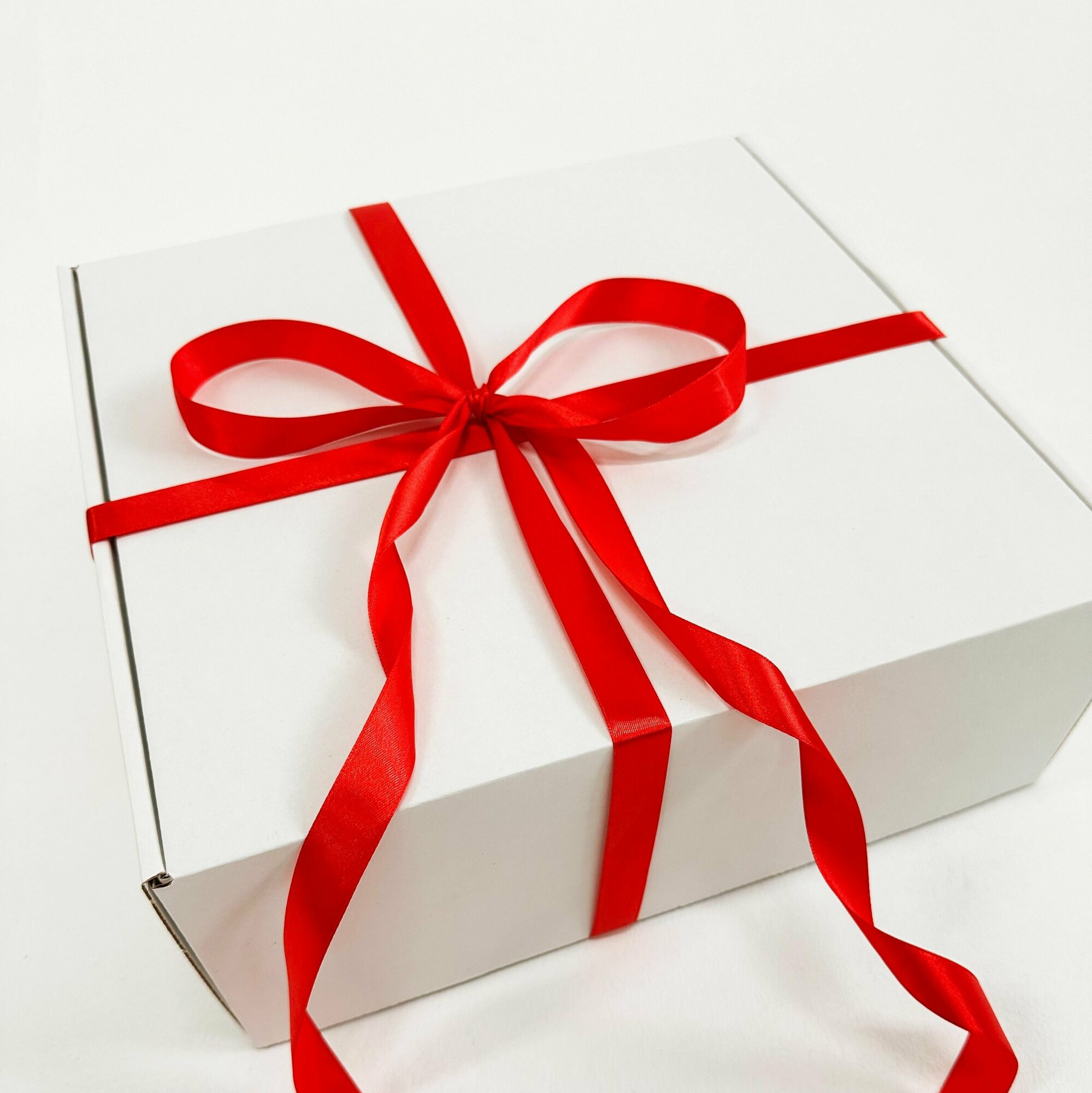 Белая подарочная коробка GILEV 32x32x12см с красной лентой и наполнителем