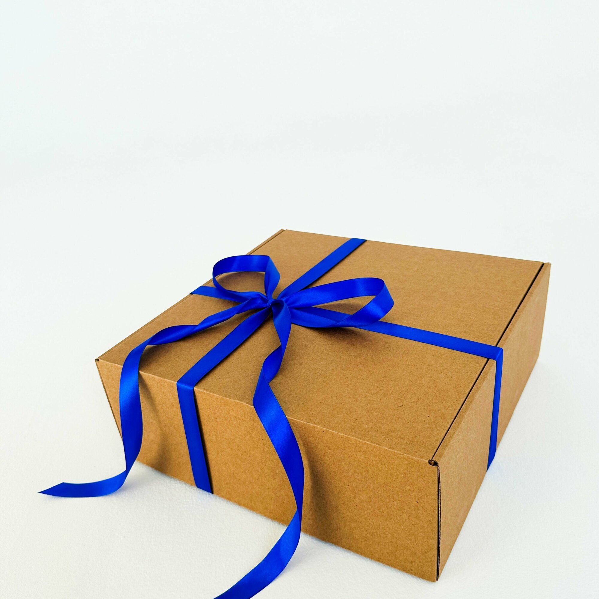 Большая подарочная коробка GILEV 37x37x14 см с синей лентой и наполнителем крафт