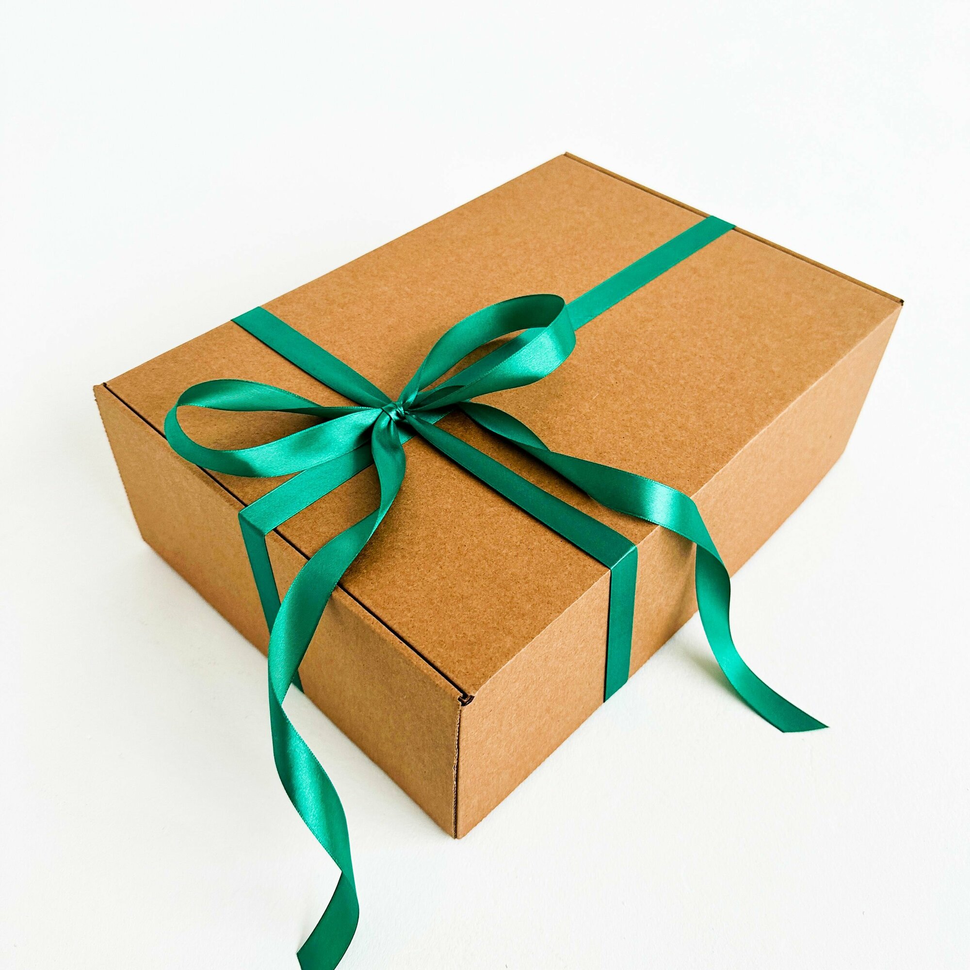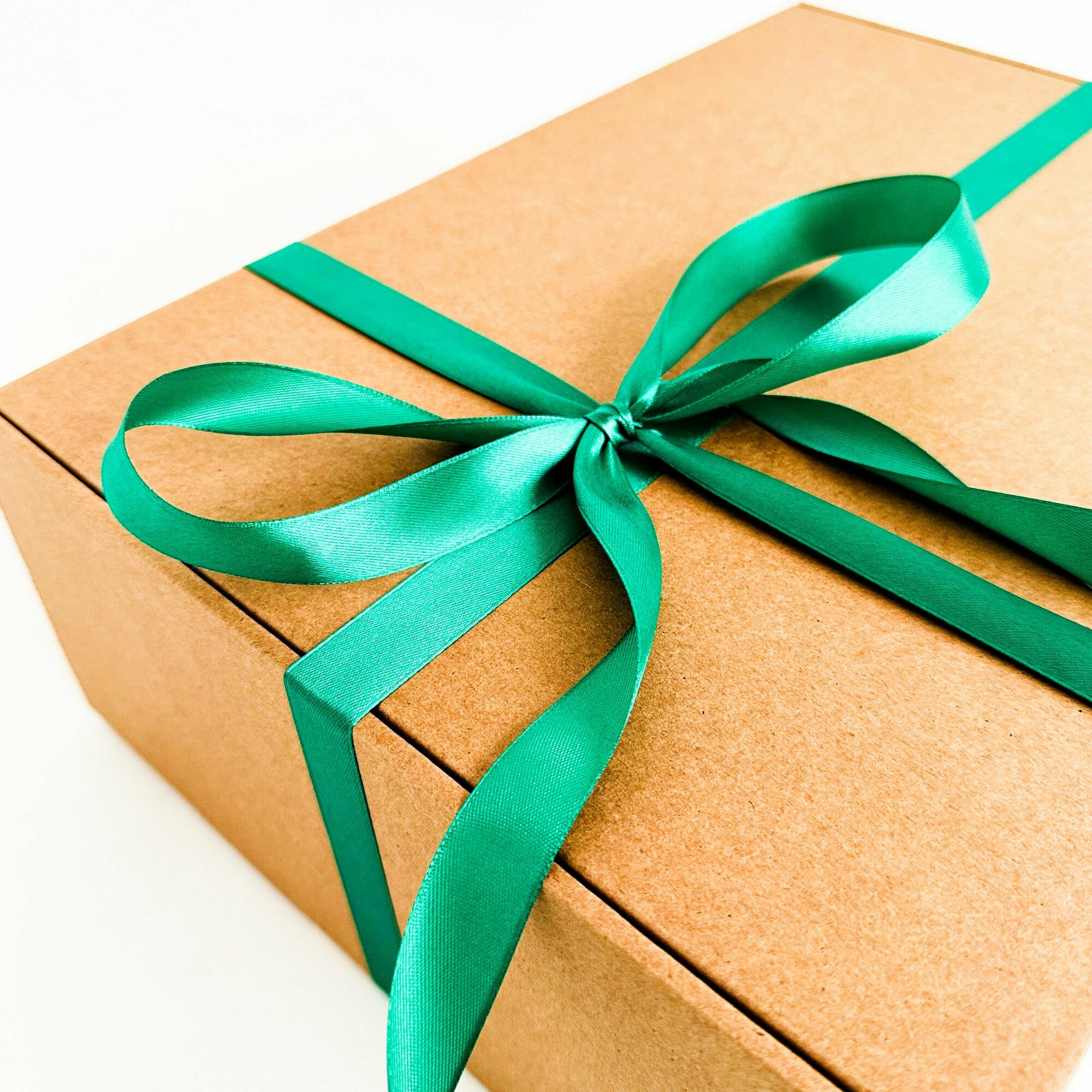 Большая подарочная коробка GILEV 44x32x15см с зеленой лентой и наполнителем крафт