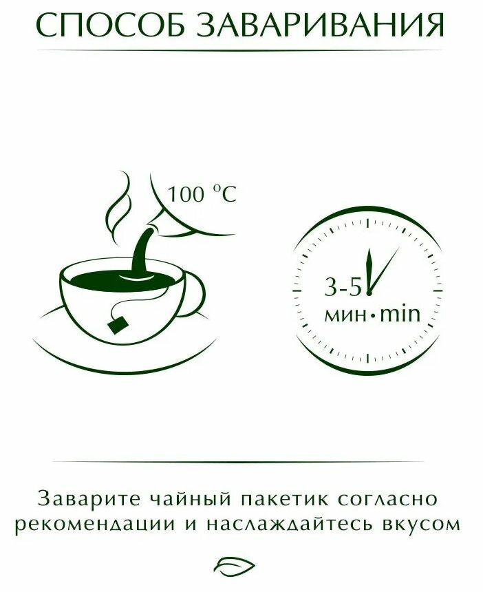| Способ приготовления | 1 пакетик чая залить кипятком 200 мл, дать настояться 3-5 минут |