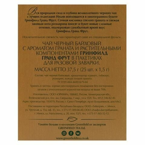 Чай GREENFIELD (Гринфилд) "Grand Fruit", черный, гранат-розмарин, 25 пакетиков в конвертах по 1,5 г, 1387-10 2 уп
