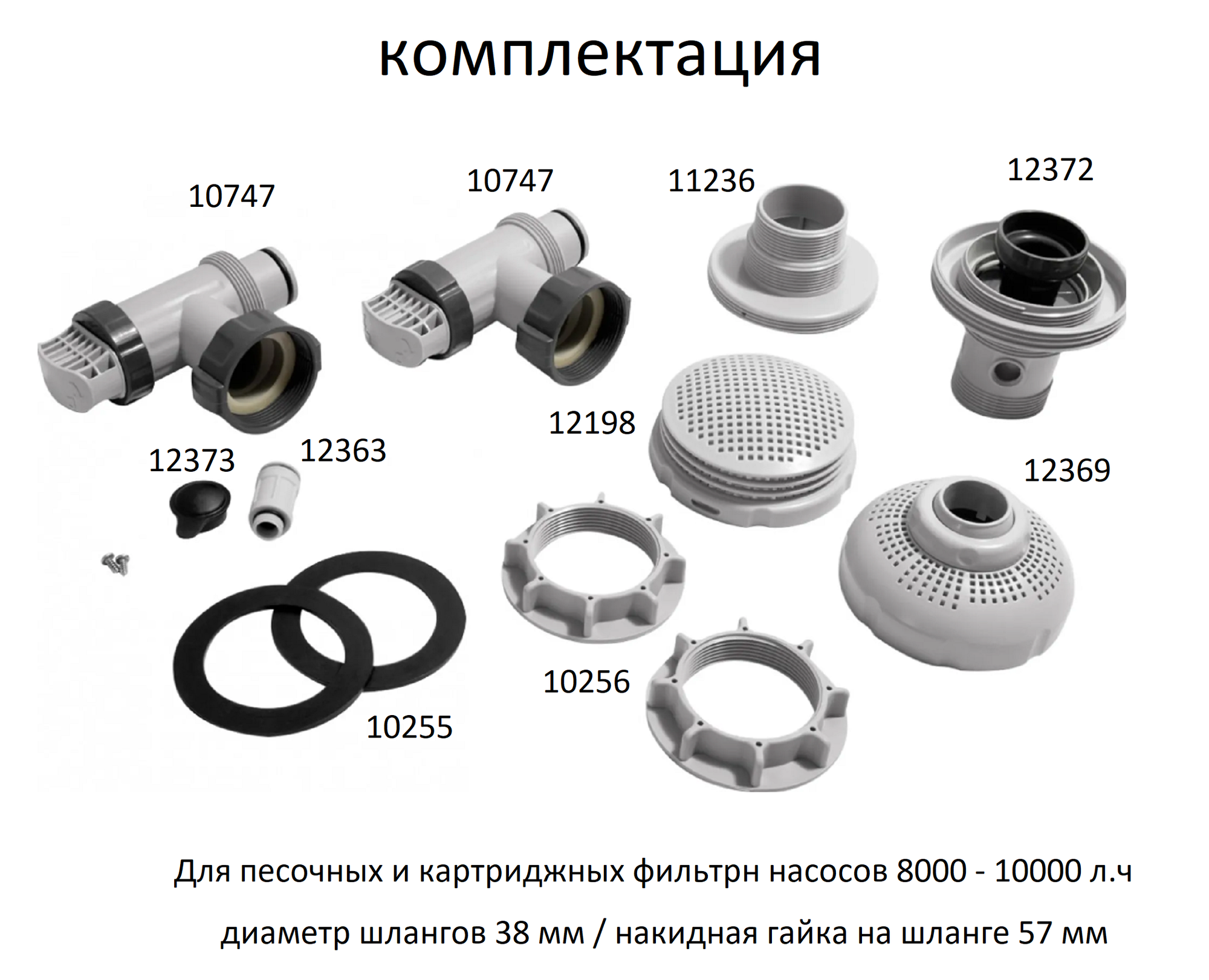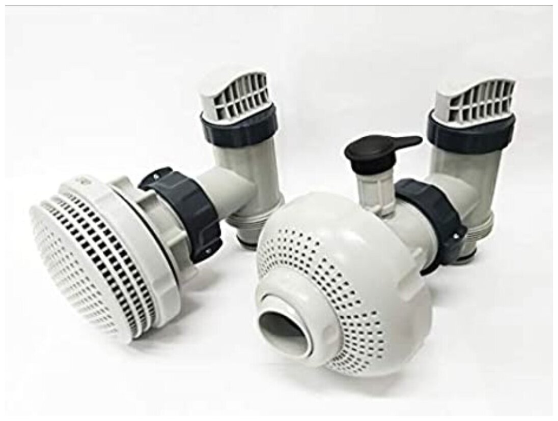 | Комплектация | Соединитель с функцией гидро-аэрации Intex 12355, впускная решетка сетчатая Intex 12198 и соединитель с гайкой и резиновой прокладкой Intex 11236, а также плунжерный клапан Intex 10747 2шт. |