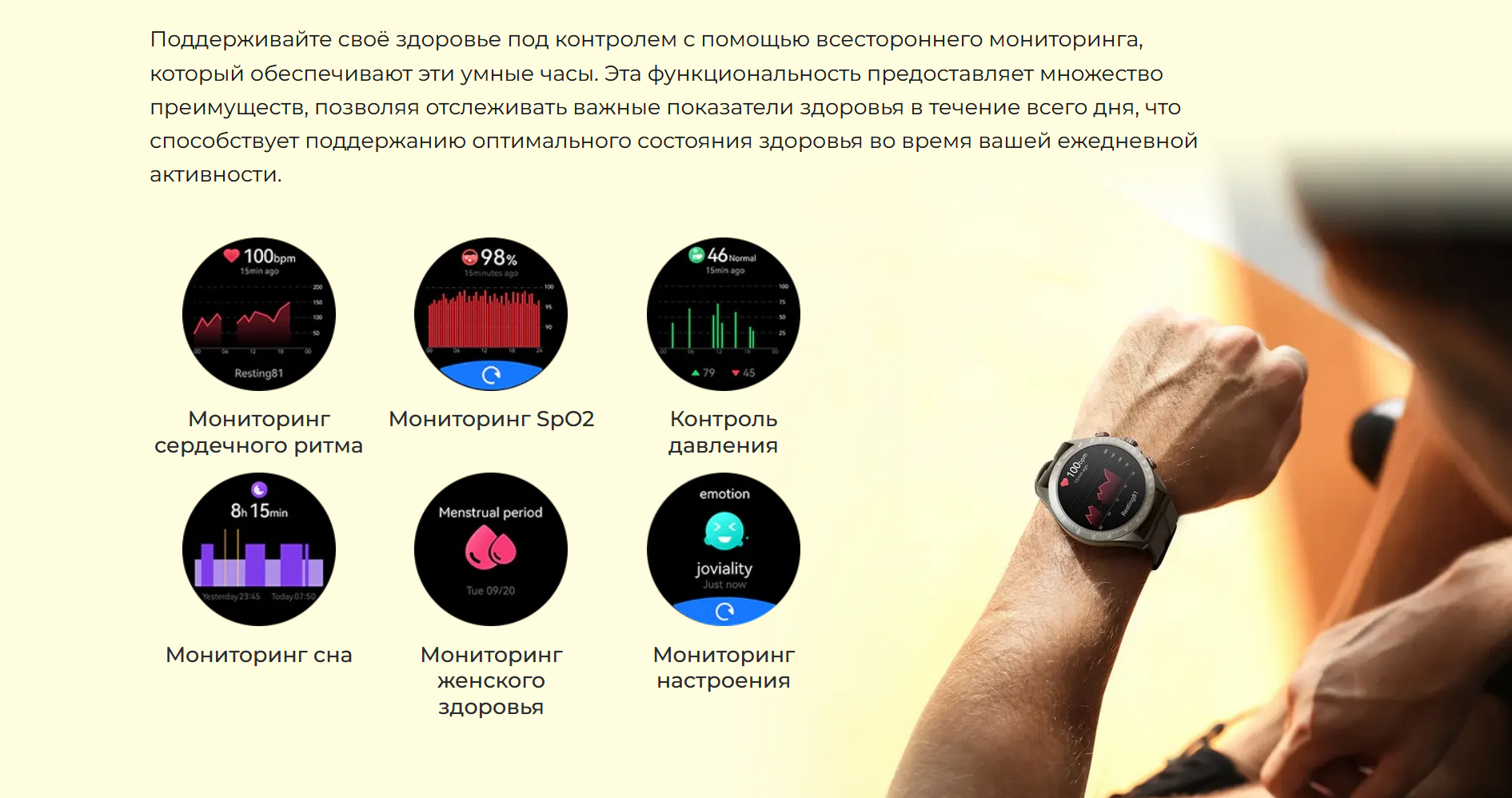 | Мониторинг | пульса, сна, уровня кислорода в крови |