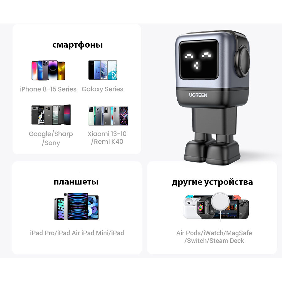 Универсальное зарядное устройство Ugreen GAN 65w Nexode ROBOT, 2 Type-C и 1 USB вход. Быстрая зарядка для телефона, ноутбука, планшета.
