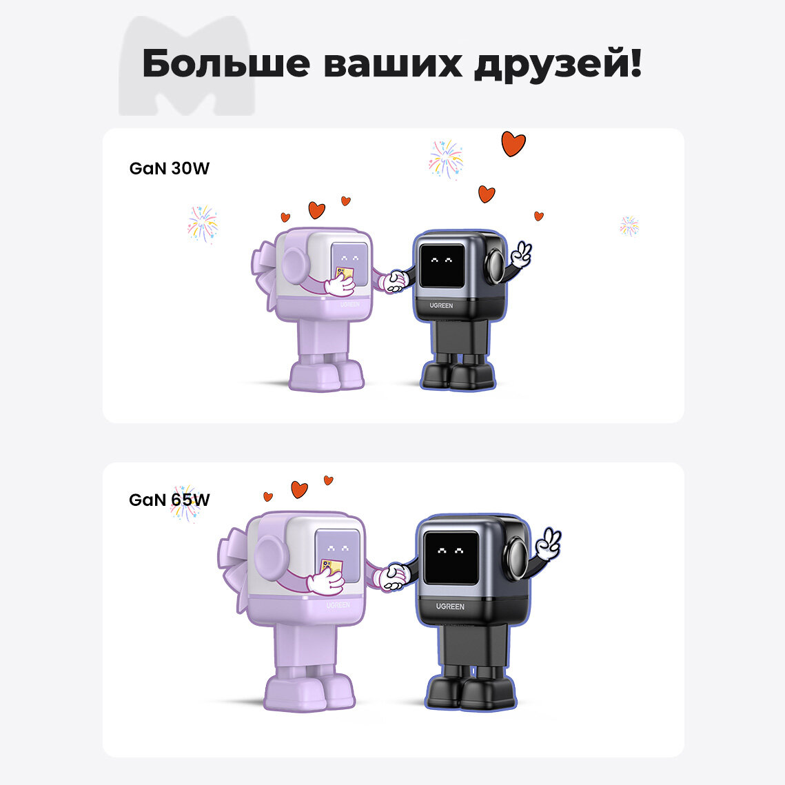 Сетевая зарядка UGREEN CD361 (35291) Robot GaN 65W розовая в виде робота русская вилка