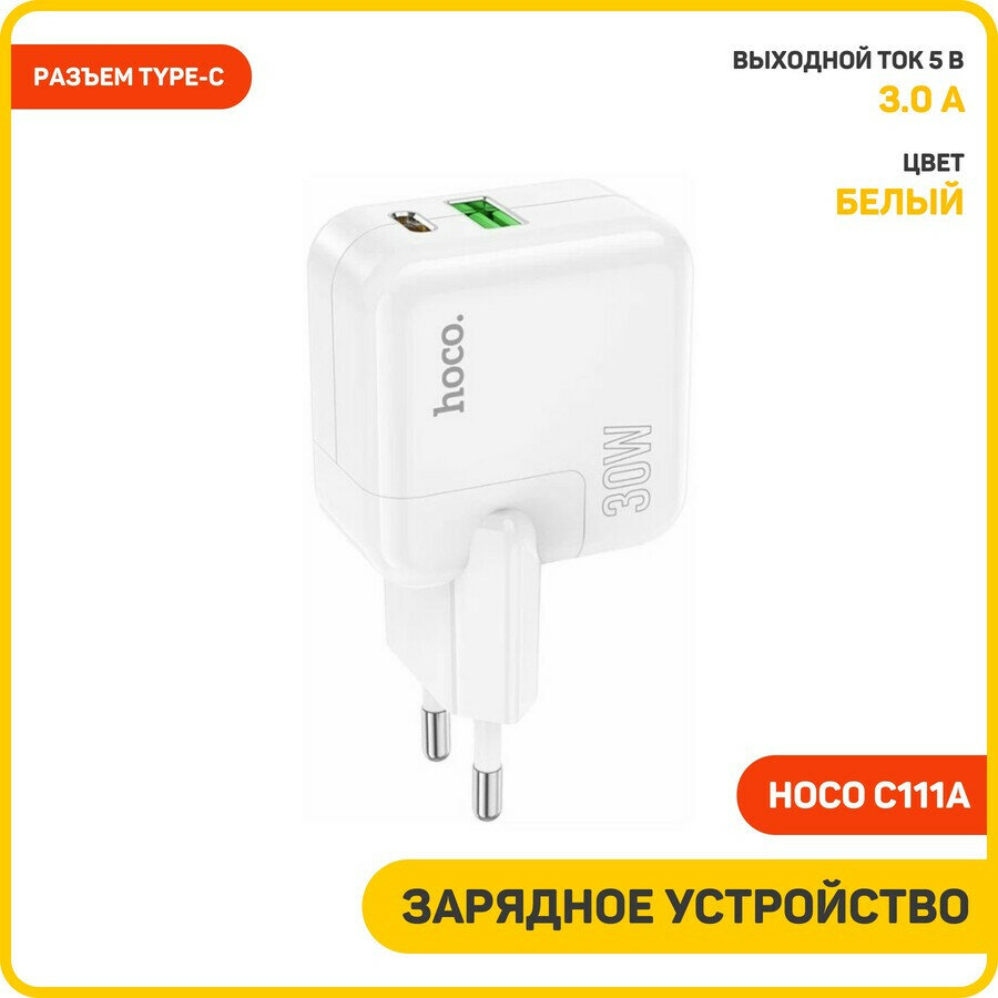 Купить Сетевое зарядное устройство HOCO C111A 1xUSB + 1xUSB Type-C с кабелем Type-C - Type-C, 3.0A, 30W, белый