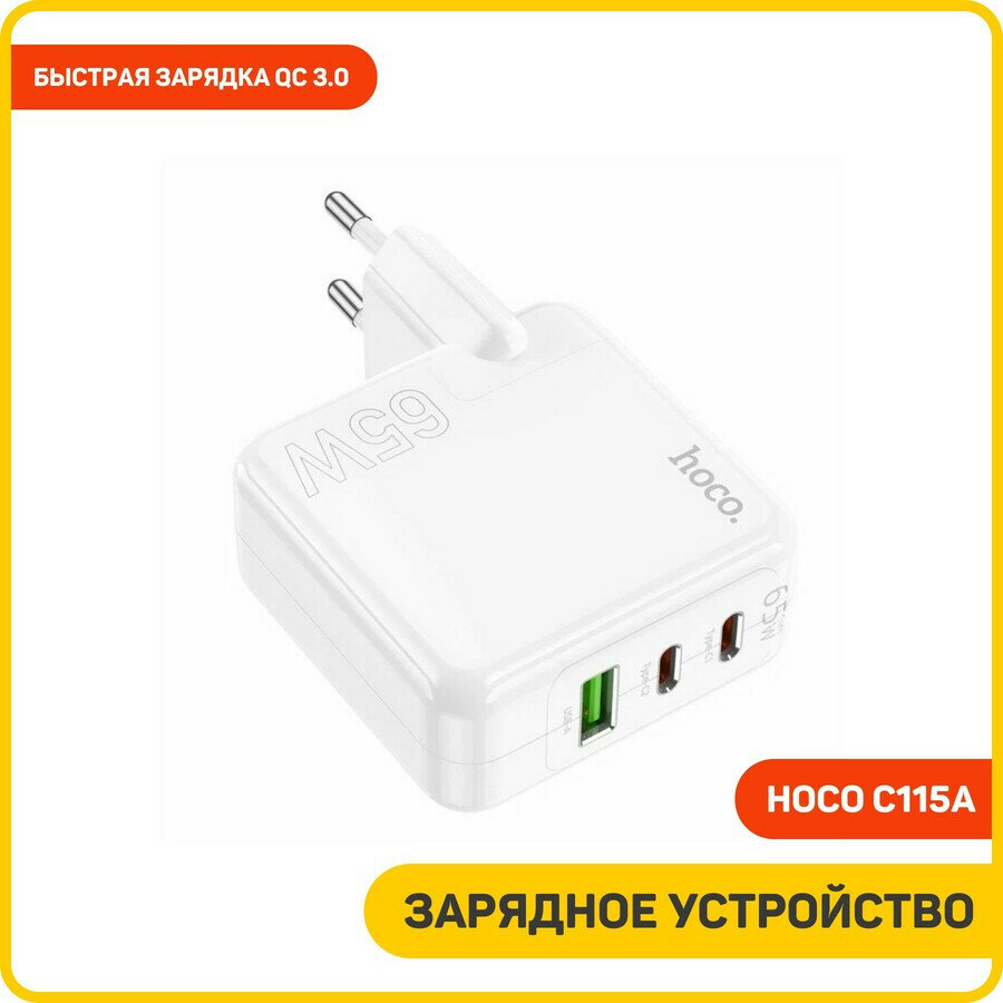 Сетевое зарядное устройство c USB A+2xType-C HOCO C115A,QC 3.0,PD 65W, белый