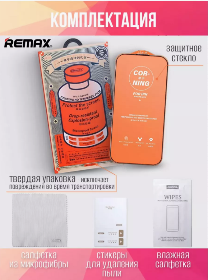 | Подробная комплектация | Надежная упаковка; супер прочное защитное стекло Remax; влажная салфетка; тряпочка из микрофибры; стикеры для удаления пыли |