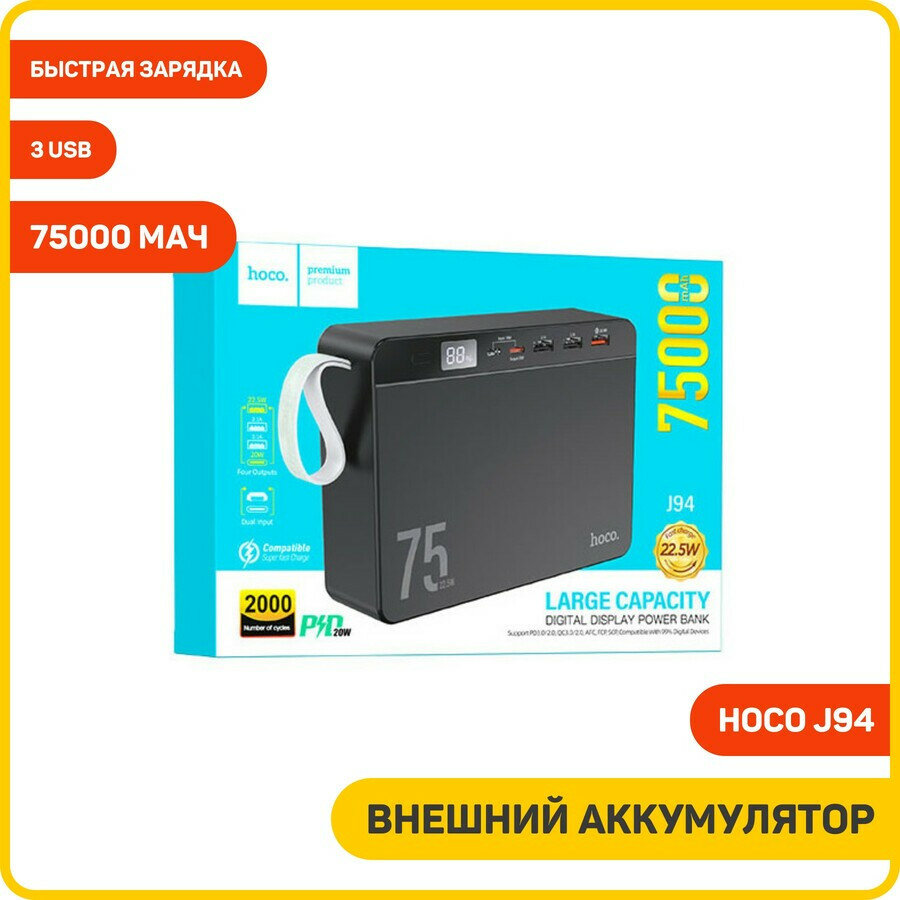 Внешний аккумулятор Hoco J94 75000 mAh, PowerBank быстрая зарядка PD 22.5В Макс, 4 выхода интересное: