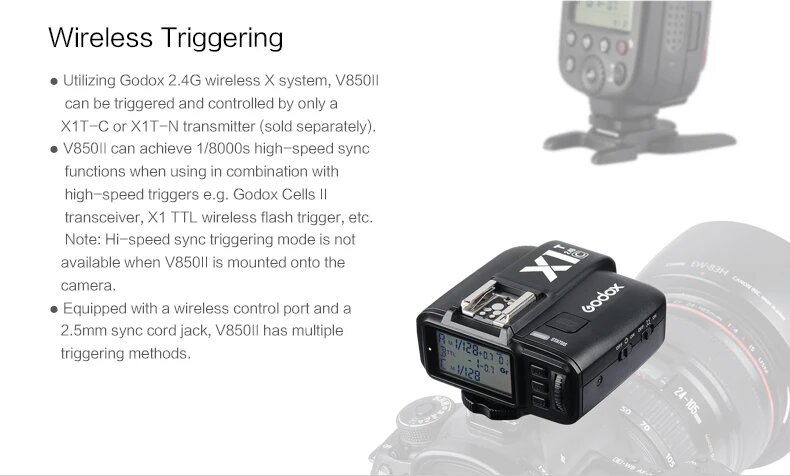 Godox V850II GN60 Off Camera 1/8000s HSS Flash Speedlite 2,4G Wireless X System Li-Ion Battery для Canon Nikon Sony DSLR Camera s, V850II интересное: