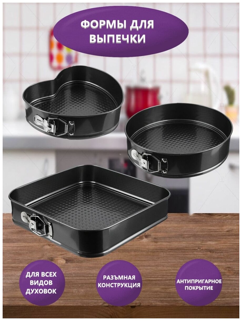 Формы для выпечки и тортов (3 шт.) с антипригарным покрытием / набор форм для выпечки / формы для выпечки - круг, квадрат, сердце