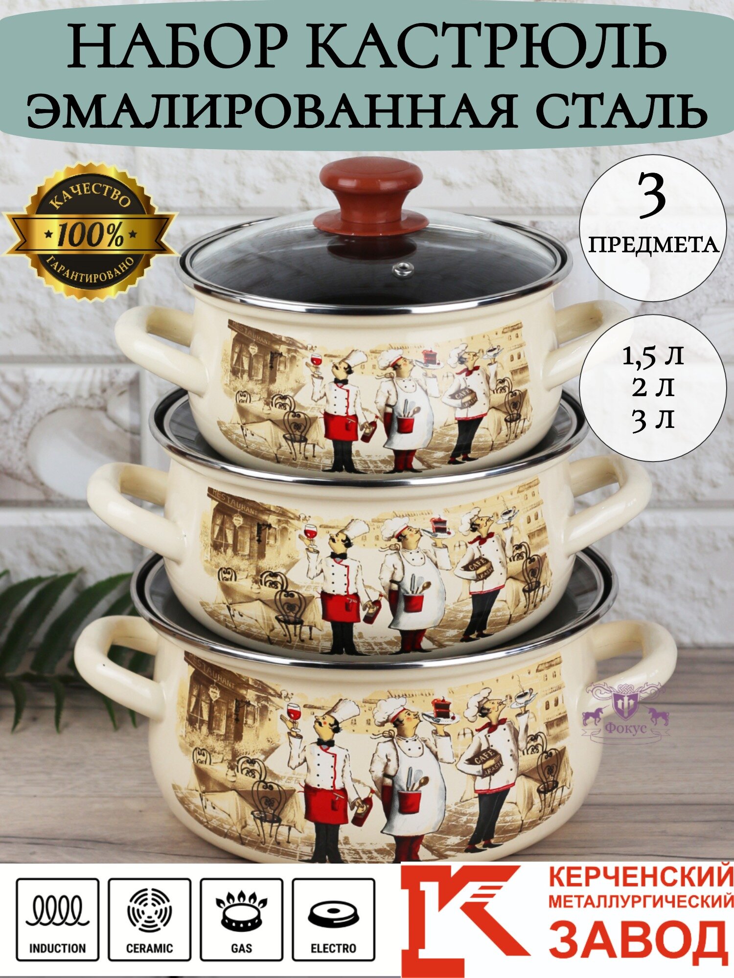 Набор кастрюль эмалированных с крышками 1,5 л, 2,3 л, 3 л, Керченский металлургический завод