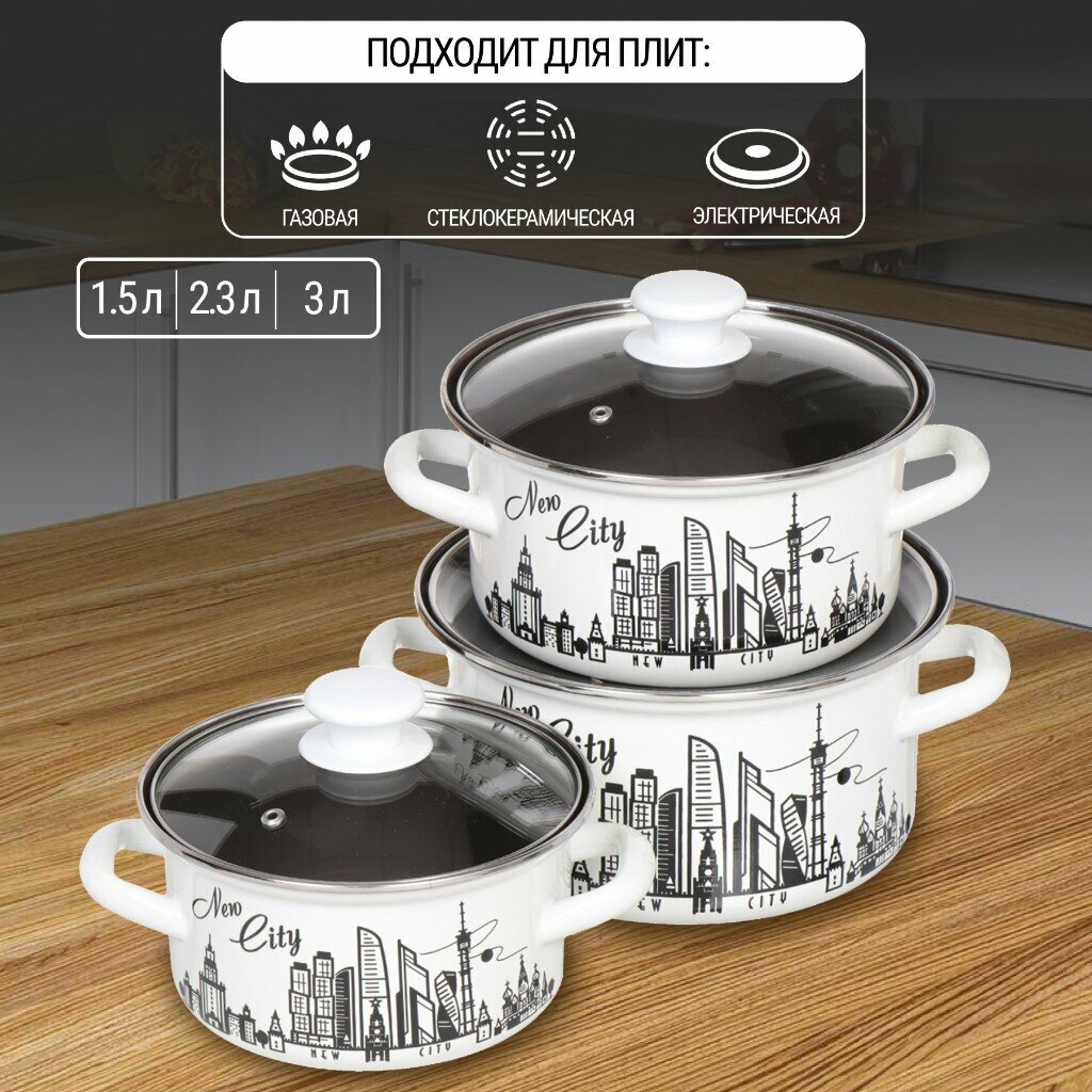 Набор эмалированных кастрюль Версаль, 3 шт