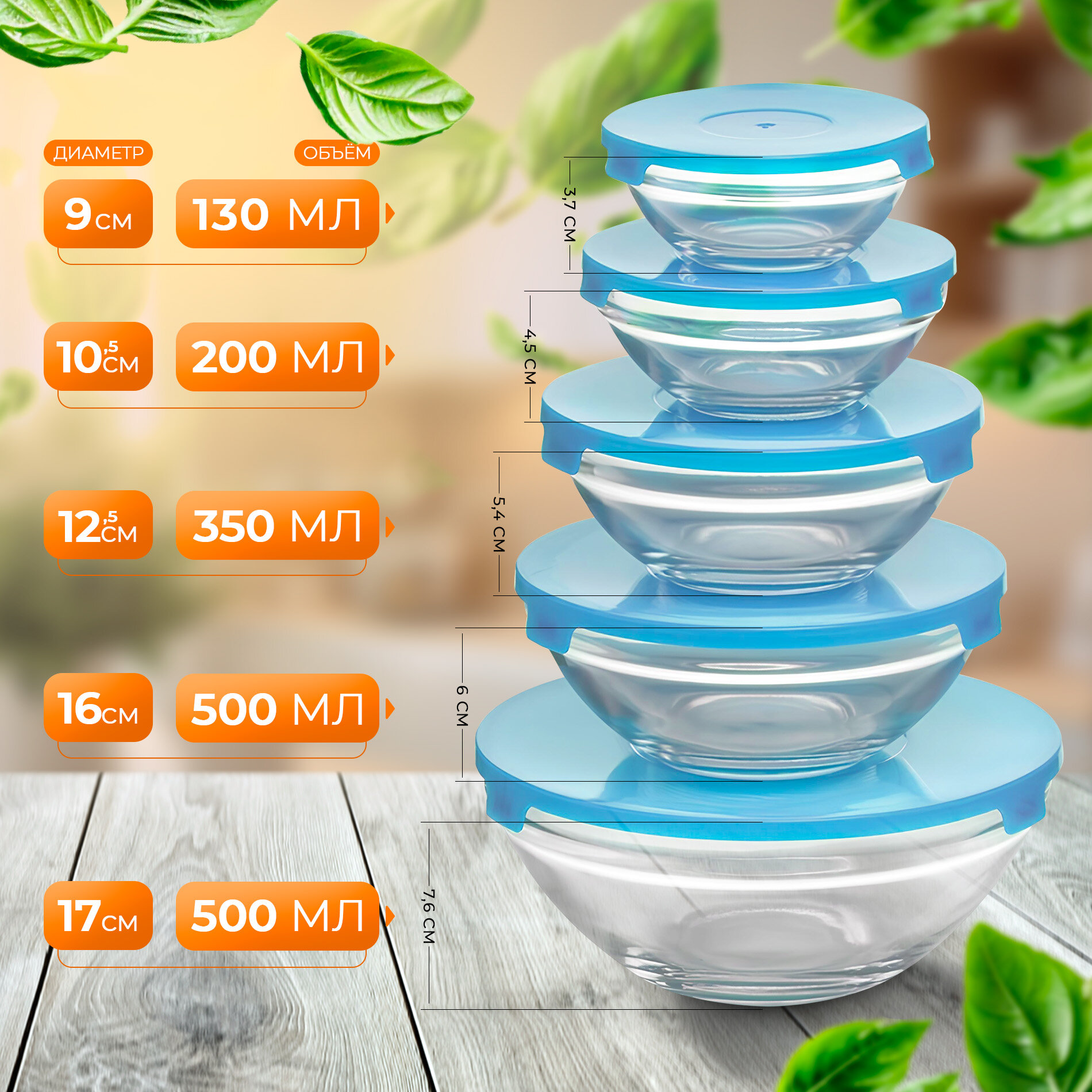 Набор салатников Доляна «Классика» с крышками, 5 предметов: 900 мл (17×7,6 см), 500 мл (16×6 см), 350 мл (12,5×5,4 см), 200 мл (10,5×4,5 см), 130 мл (9×3,7 см), цвет голубой