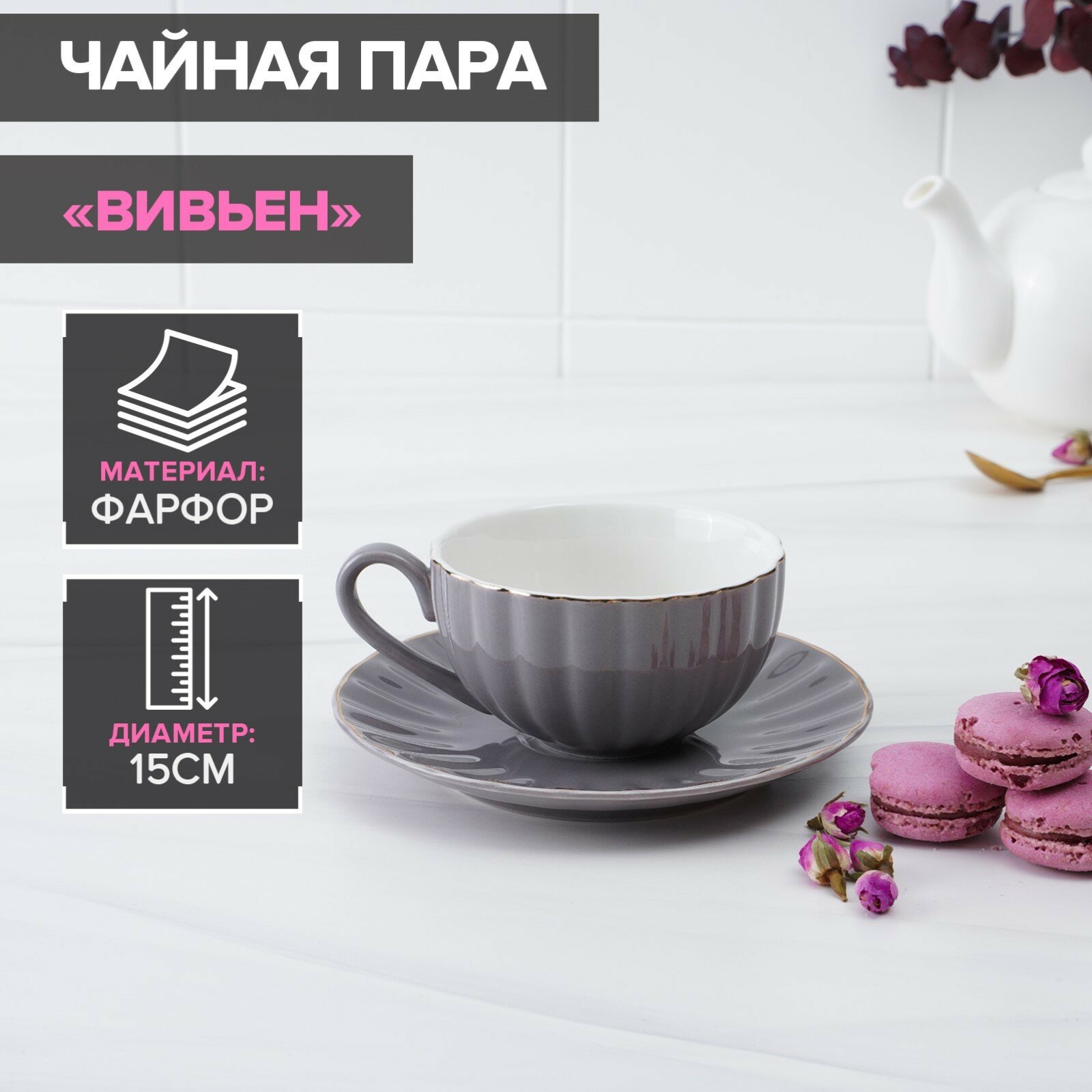 Купить Чайная пара фарфоровая Доляна «Вивьен»: чашка 200 мл, блюдце d=15 см, цвет серый
