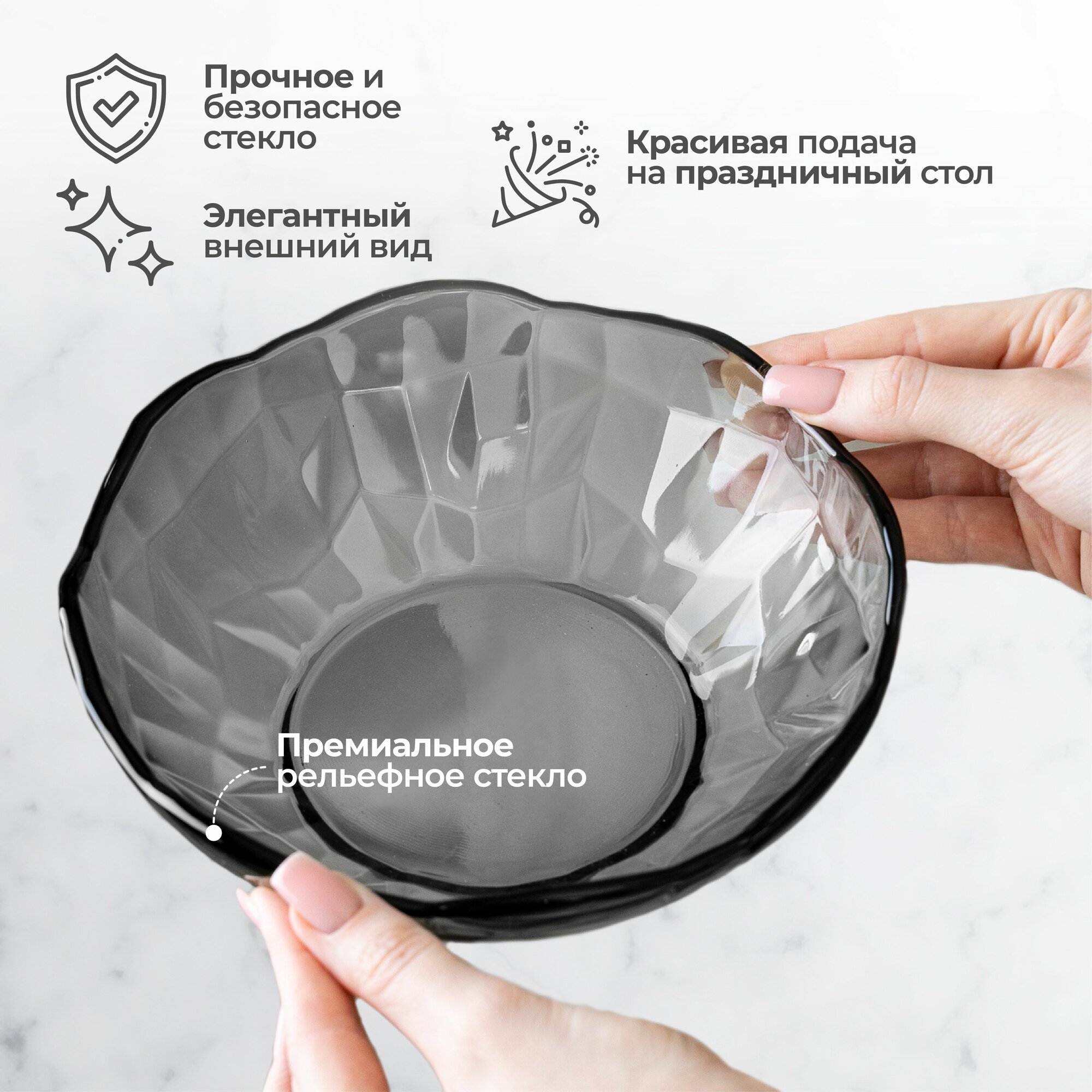 Тарелки набор из силикатного стекла Diamante scuro, салатники глубокие, 13 см 6 шт. 440 мл