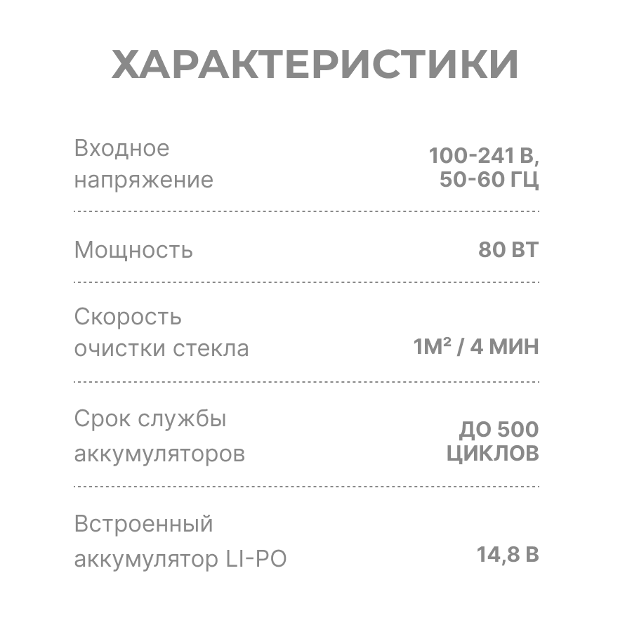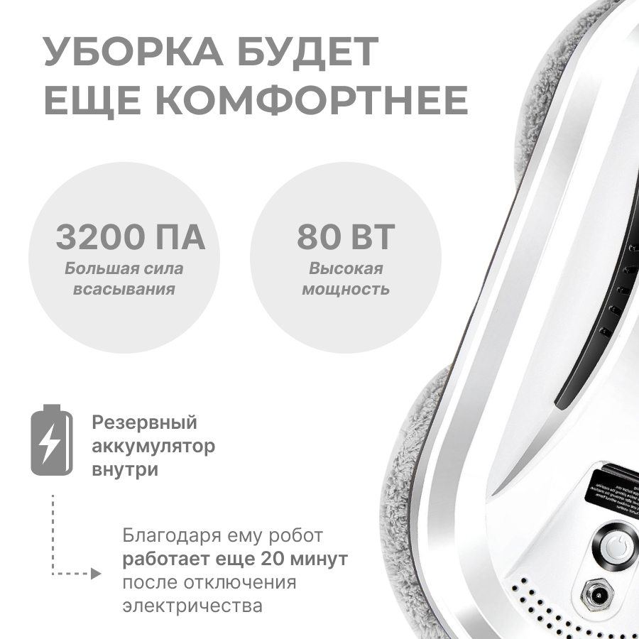 | Особенности | автоматическая остановка / автоматическое определение зоны уборки / мойка безрамных поверхностей |