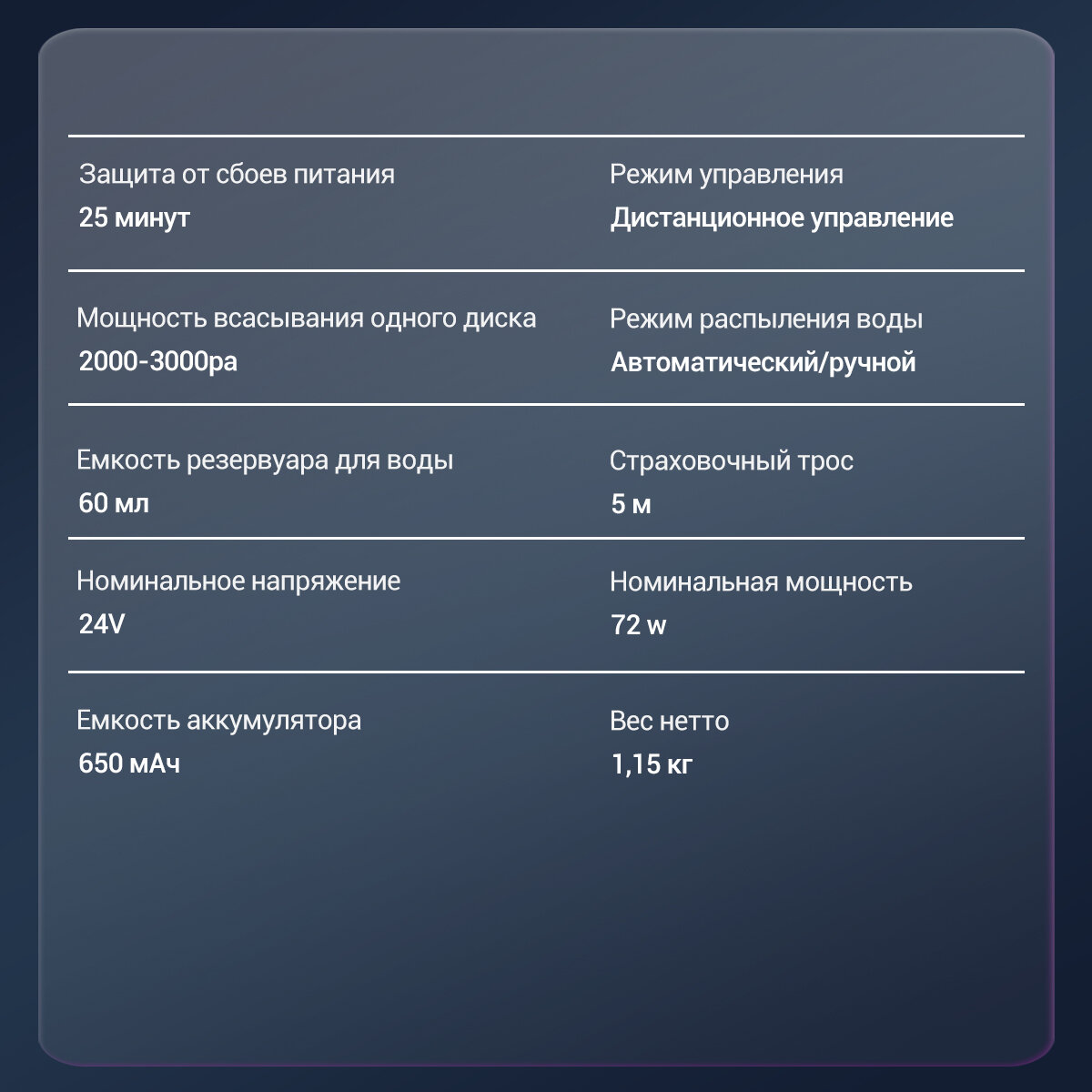 | Особенности | автоматическая остановка / автоматическое определение зоны уборки / звуковая индикация / мойка безрамных поверхностей / обход препятствий / светодиодная индикация |