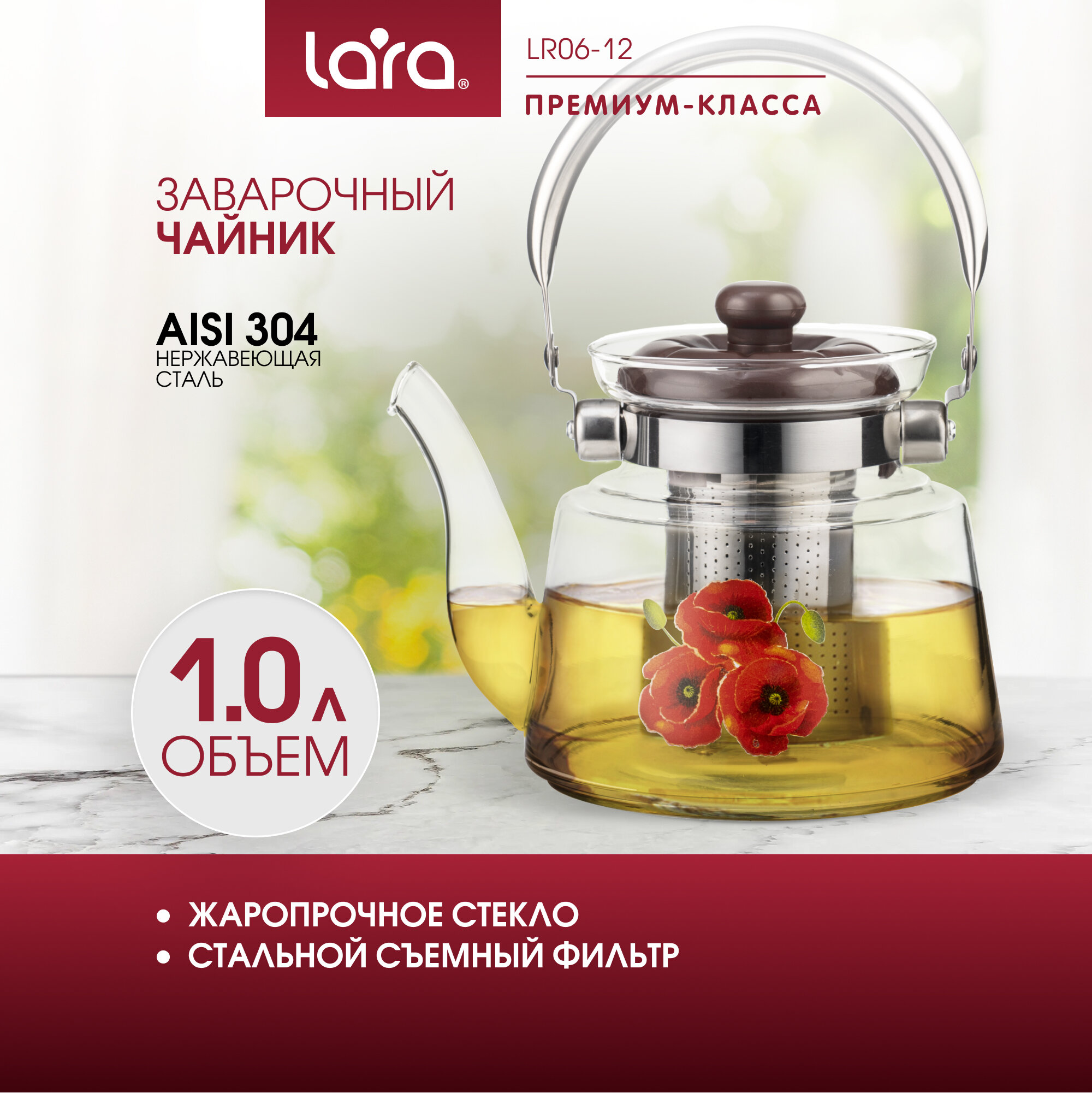 Купить Чайник заварочный Lara, LR06-12, боросиликатное стекло, 1л