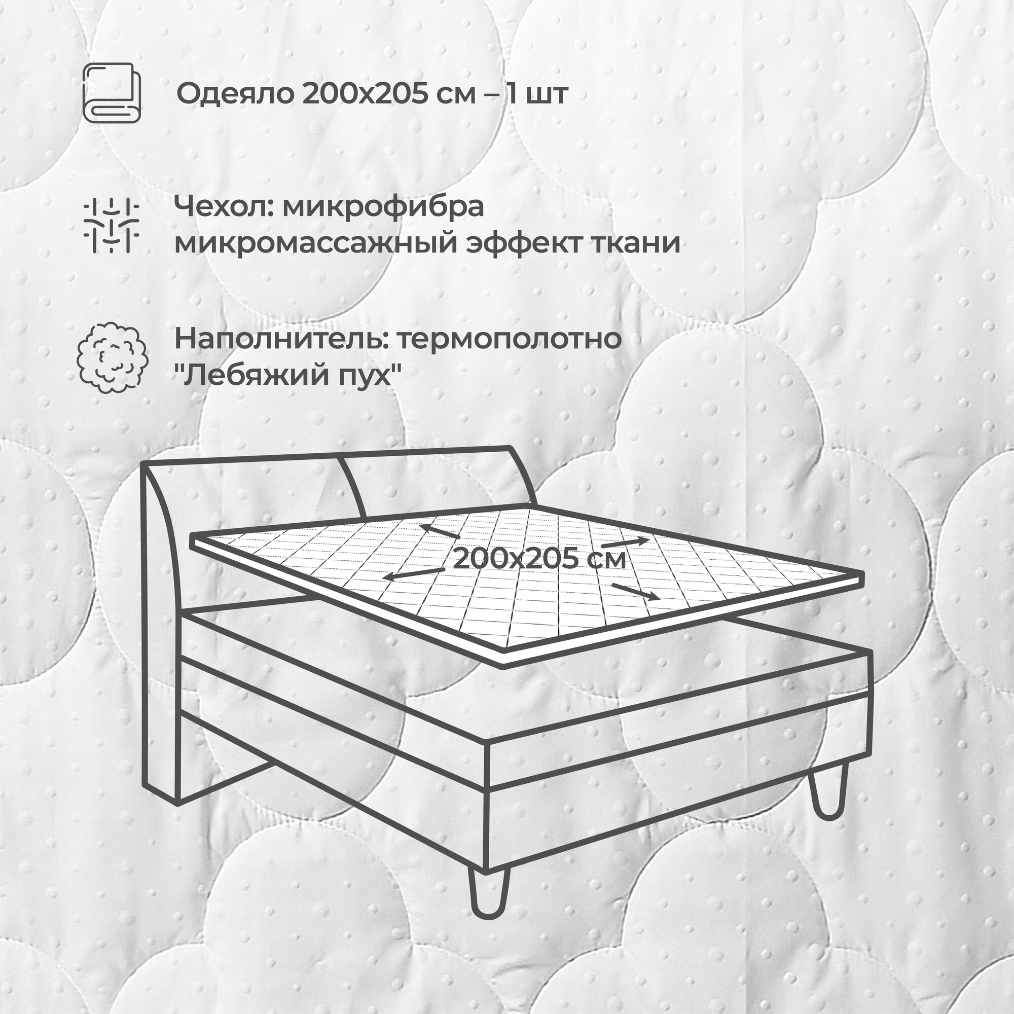 | Дополнительная информация | эмбассированная микрофибра, лебяжий пух, Одеяло с Зd эффектом,Сделано в Росии, микромассаж, всесезонное. микрофибра, полиэстер, гиппоалергенно, эмбассированная микрофибра - 3d, микроволокно, |