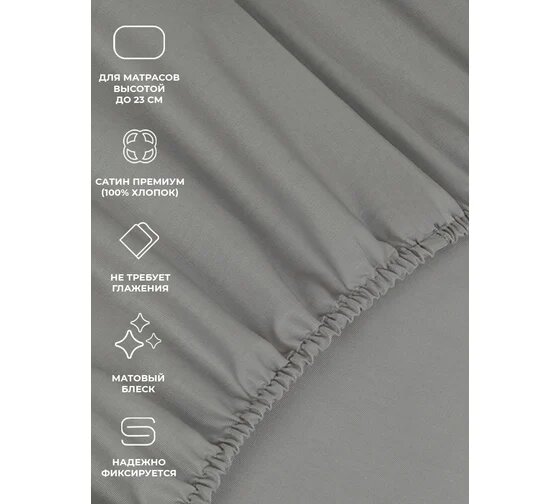 Простынь на резинке Ecotex "Моноспейс", сатин - 100% хлопок, 160х200х23 серый