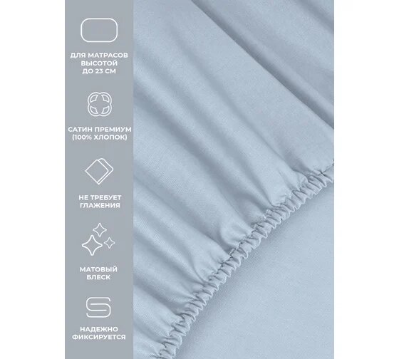 Простынь на резинке Ecotex "Моноспейс", сатин - 100% хлопок, 180х200х23 серо-голубой