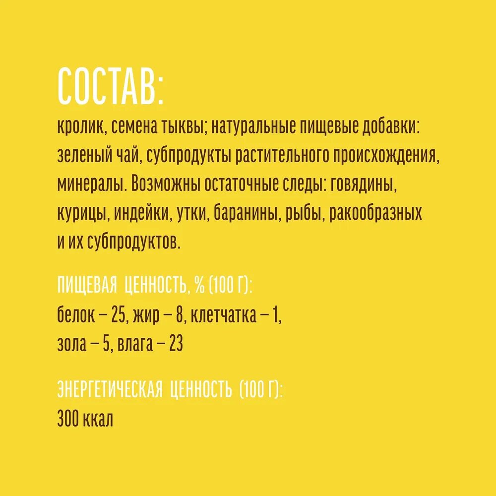 | Состав | кролик, семена тыквы; натуральные пищевые добавки: зеленый чай, субпродукты растительного происхождения, минералы. Возможны остаточные следы: говядины, курицы, индейки, утки, баранины, рыбы, ракообразных и их субпродуктов |