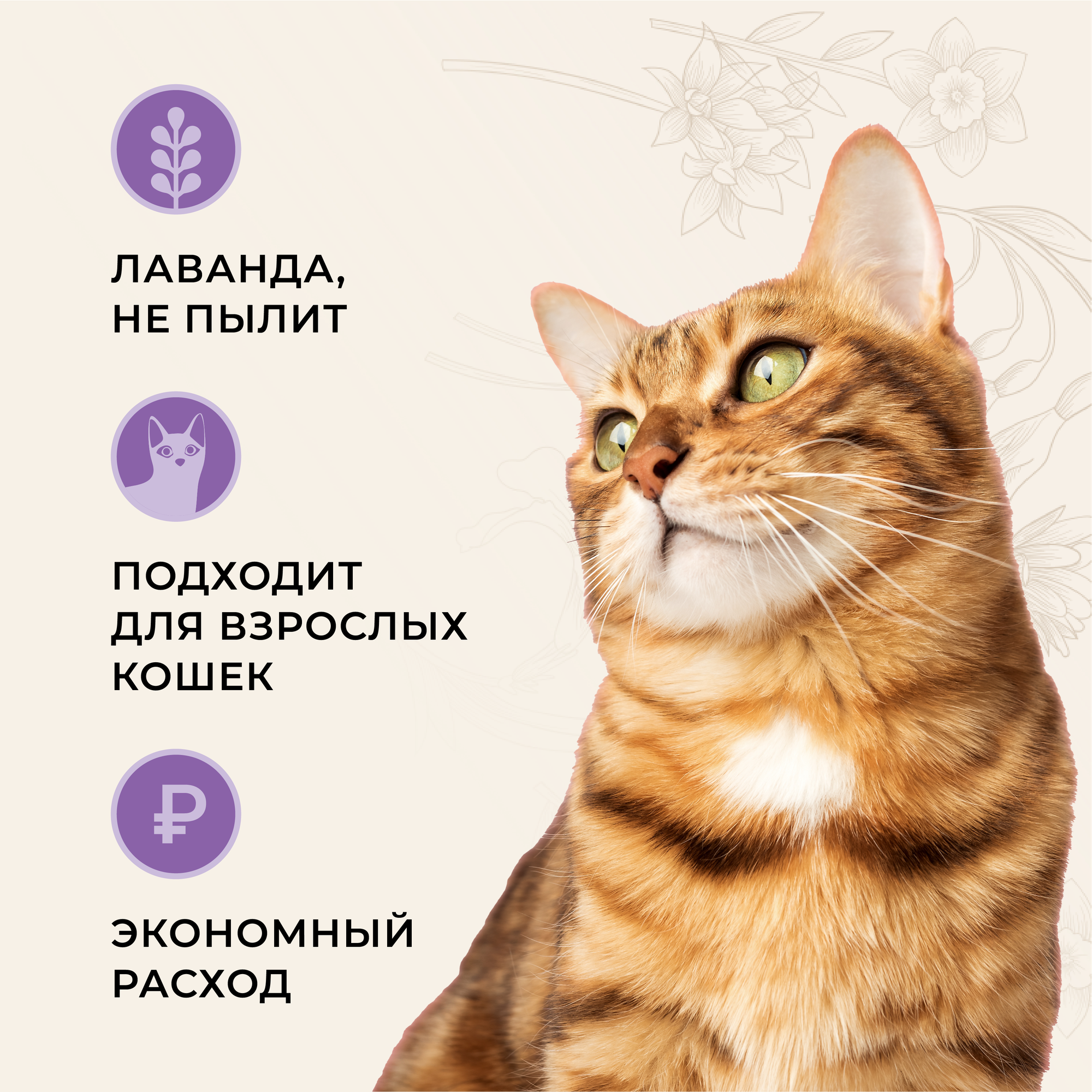 | Информация от производителя | с ароматом лаванды; гранулы 0.6 - 2.25 мм; не пылит; впитывание 300 - 330% |