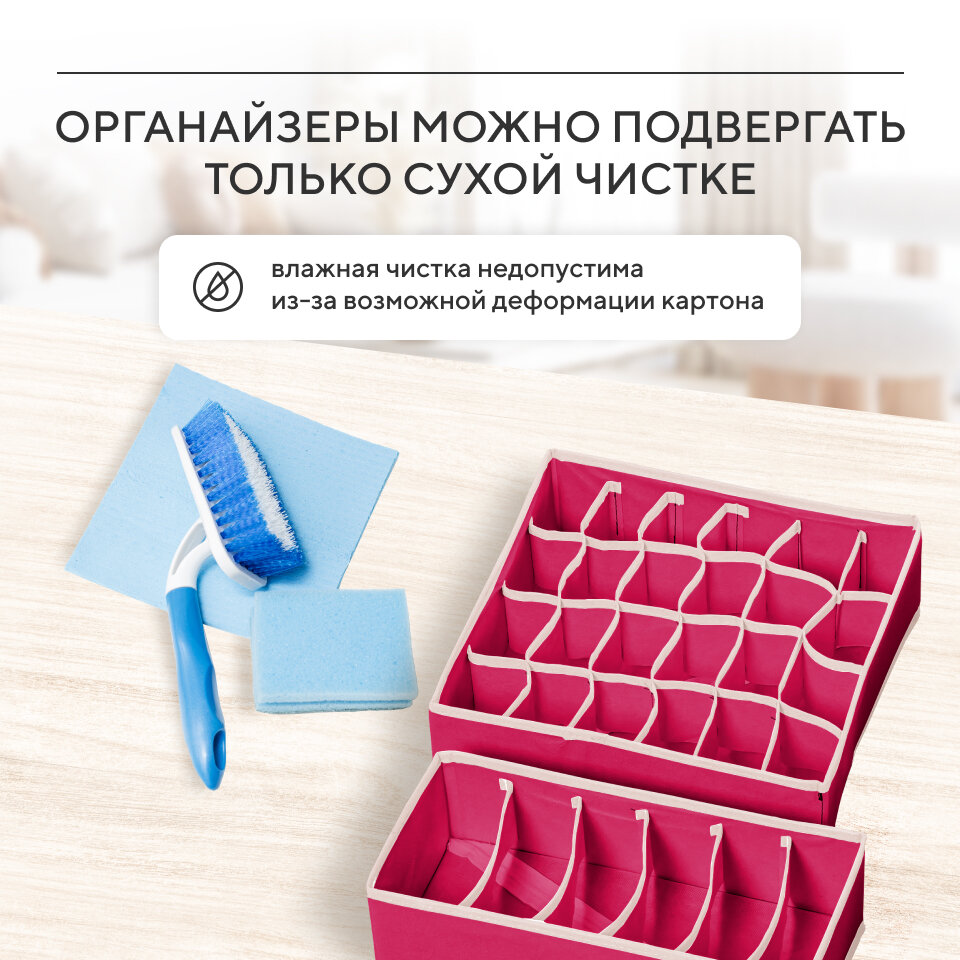 | Комплектация | Кофр для бюстгальтеров 7 ячеек - 1 шт, Кофр для носков и галстуков 8 ячеек - 1 шт, Кофр для нижнего белья 24 ячейки - 1 шт, Кофр для шарфов 6 ячеек - 1 шт |