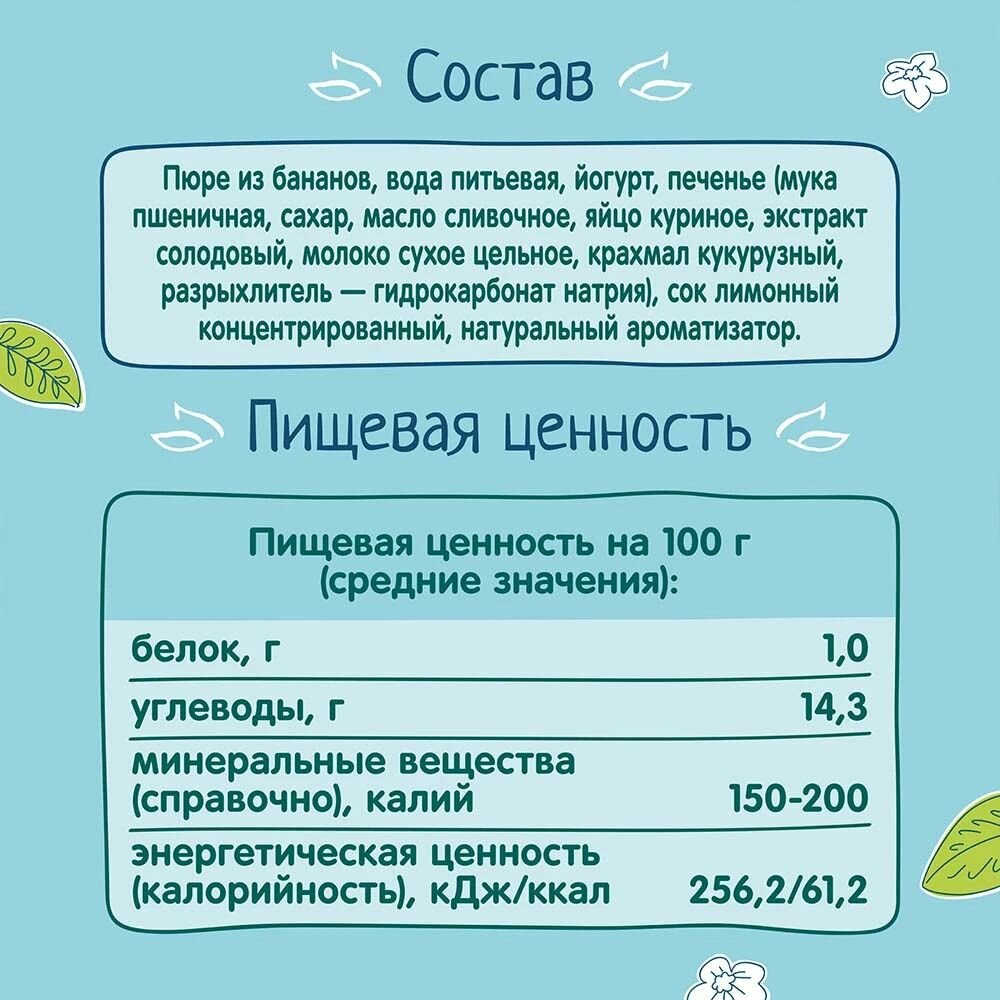 | Состав | Пюре из бананов, вода питьевая, йогурт, печенье (мука пшеничная, сахар, масло сливочное, яйцо куриное, экстракт солодовый, молоко сухое цельное, крахмал кукурузный, разрыхлитель - гидрокарбонат натрия), сок лимонный концентрированный, натуральный ароматизатор. |