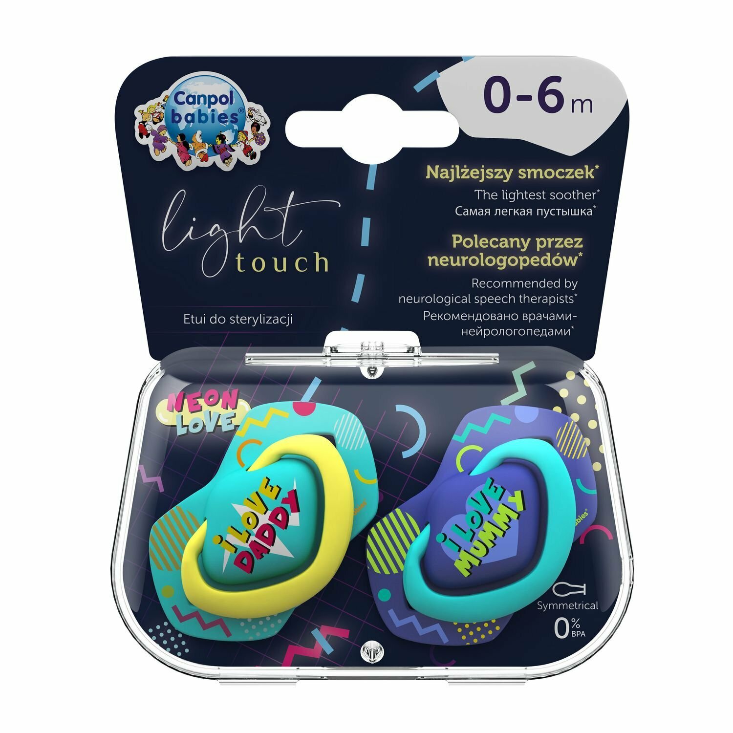 Соска пустышка силиконовая Canpol babies Neon Love симметричная для новорожденных 0-6 месяцев, набор 2 пустышки с футляром, голубой