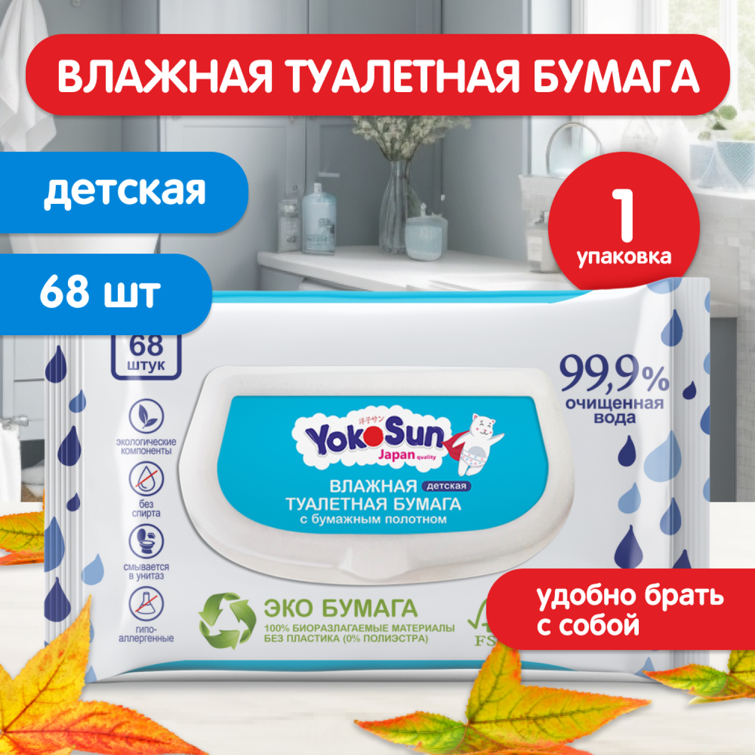Детская влажная туалетная бумага YokoSun биоразлагаемая, 68 шт.