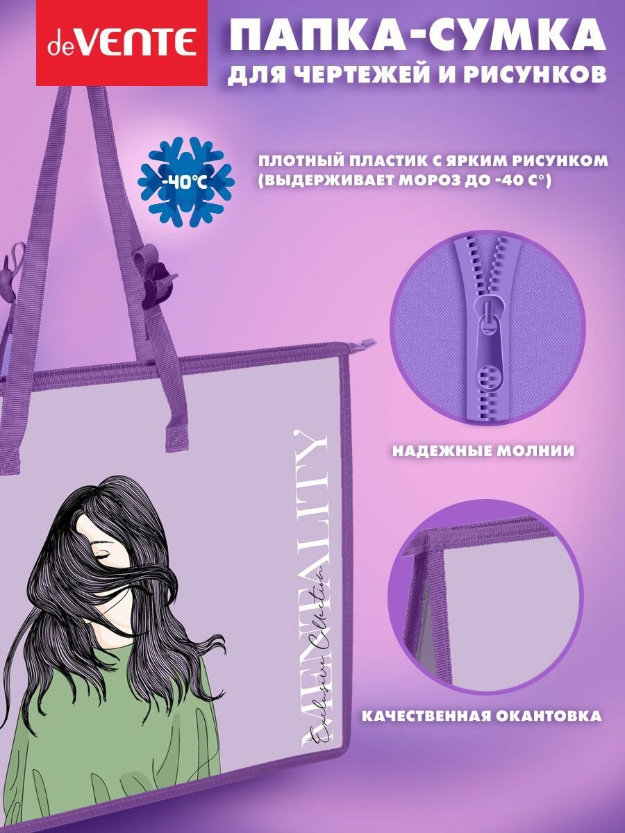Папка для чертежей и рисунков А3 с ручками пластик молния сверху, deVENTE Mentality, 467 х 338 х 100 мм, внутренний карман