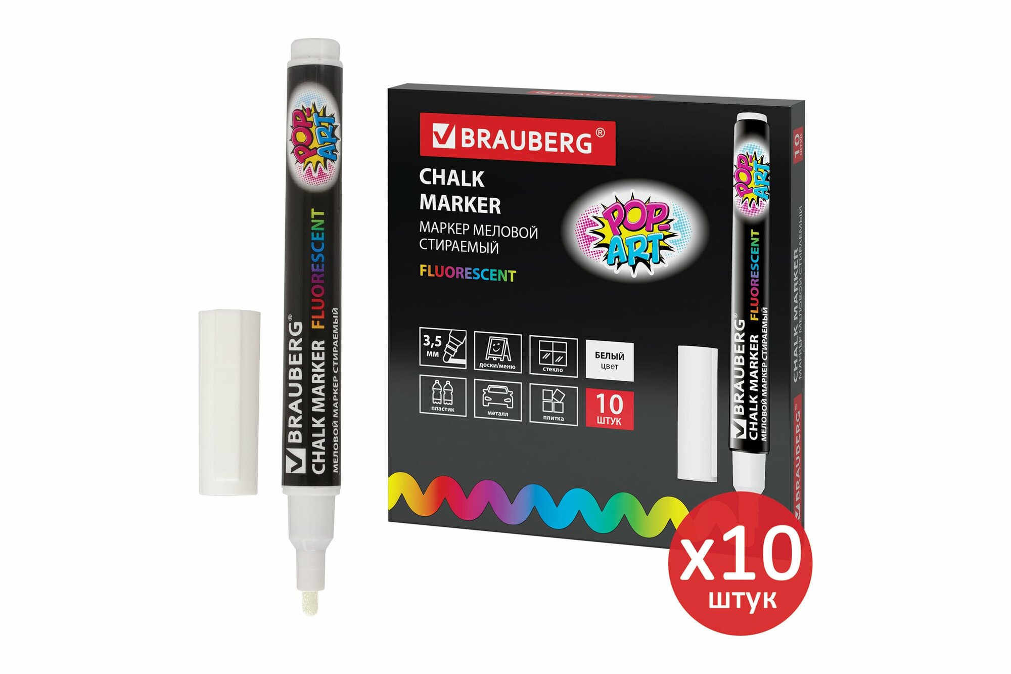 Купить Маркеры / фломастеры меловые стираемые для доски белые, Brauberg Pop-art, 3,5 мм, Выгодный Комплект 10 штук, 880740