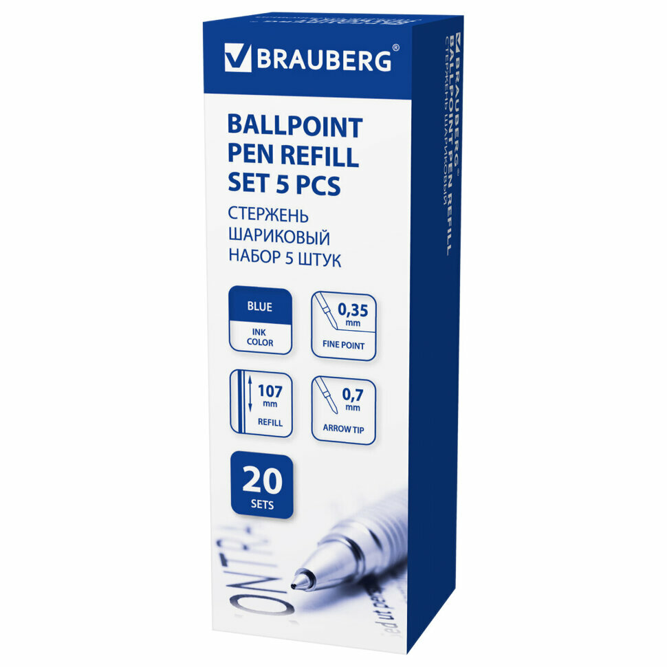 Купить Стержни шариковые BRAUBERG, набор 5 шт., 107 мм, синие, узел 0.7 мм, линия письма 0.35 мм, 170192