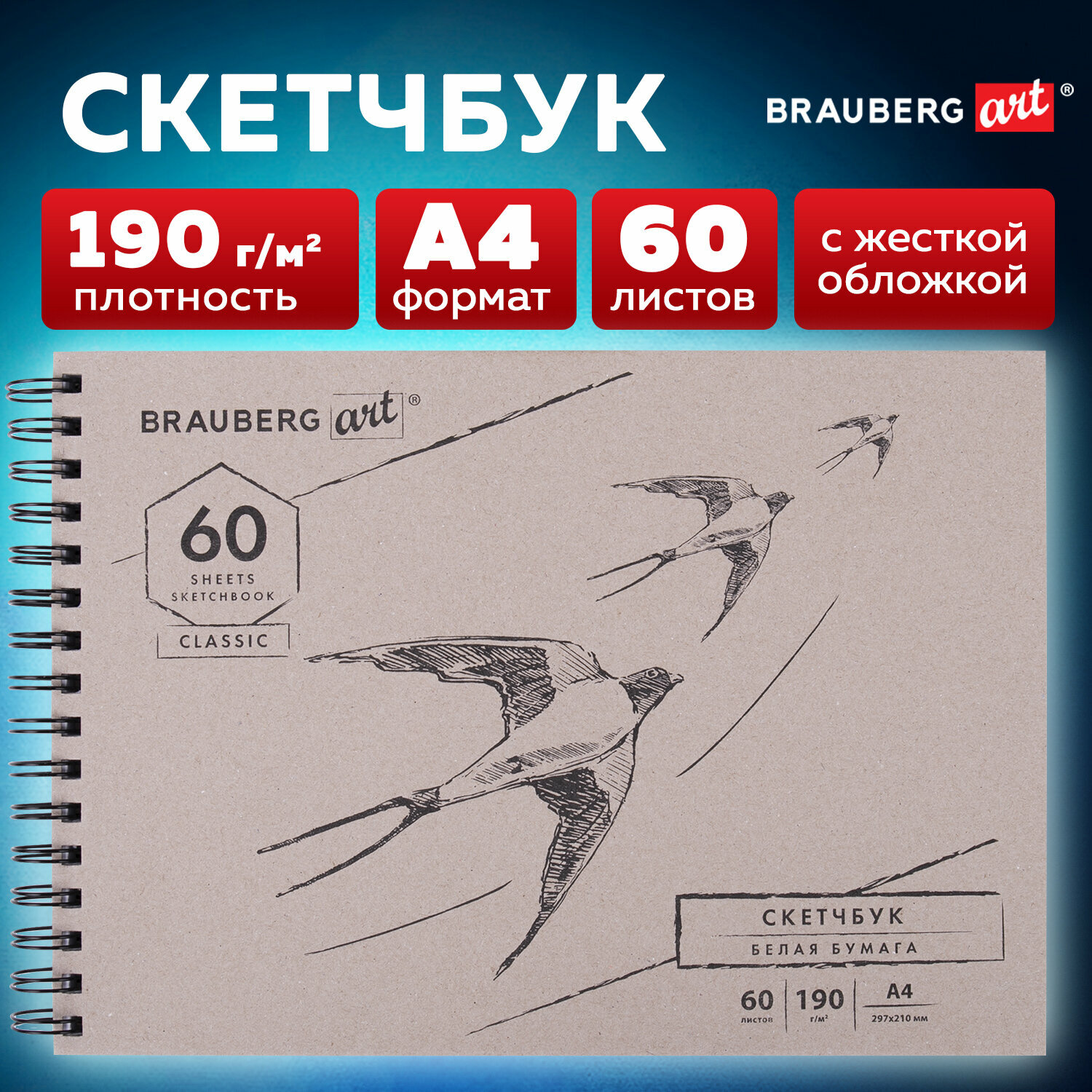 Скетчбук, белая бумага 190 г/м2, 297х210 мм, 60 л., гребень, твердая обложка, BRAUBERG ART CLASSIC, 113853