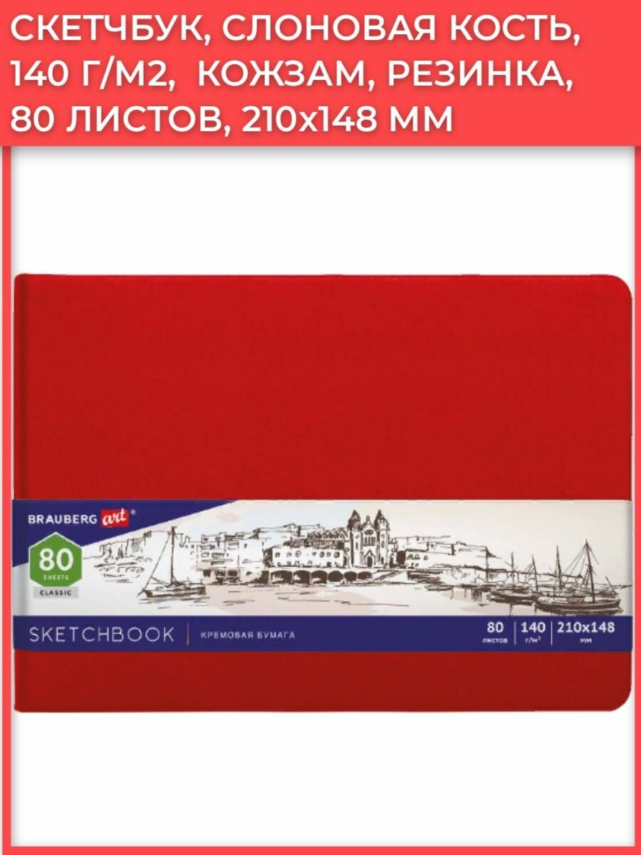 Купить Скетчбук, слоновая кость 140г/м 210х148мм, 80л, кожзам, резинка, BRAUBERG ART_CL, красный, 113197