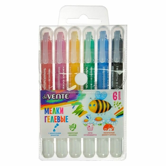 Мелки гелевые 6 цветов deVENTE, супермягкие, с акварельным эффектом, пластиковый корпус с поворотным механизмом