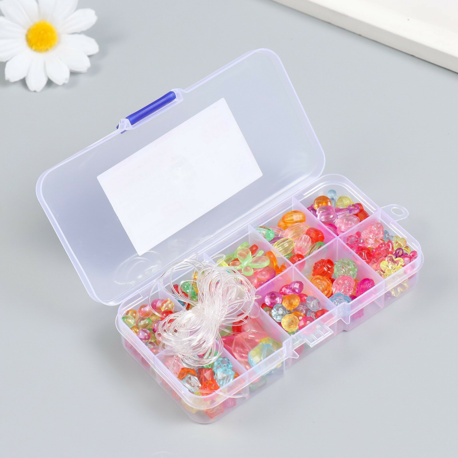 | Дополнительная информация | В набор входит 200 пластиковых бусин, 3 метра эластичной нити и компактный пластиковый бокс с ячейками и защелками. Бусины прозрачные, различных цветов и форм, всего 10 видов: разнообразные кристаллы, кулоны, цветы, бабочки, фрукты, ягоды. Каждый вид бусин находится в отдельной ячейке. Диаметр эластичной нити - 0,5 мм |