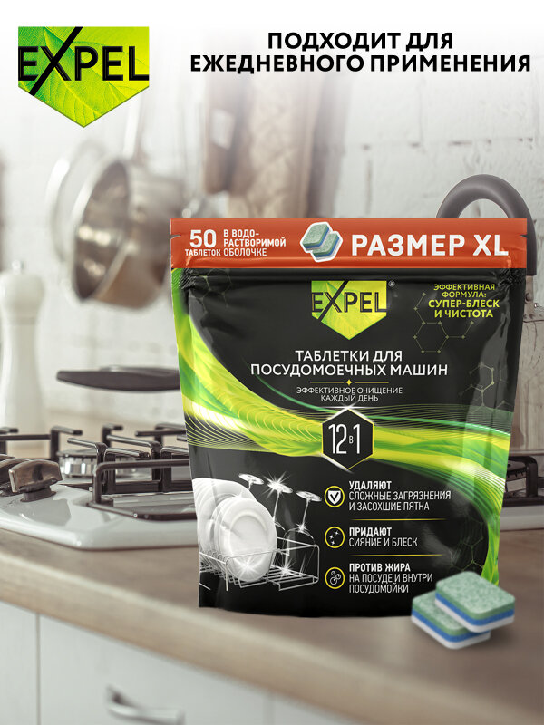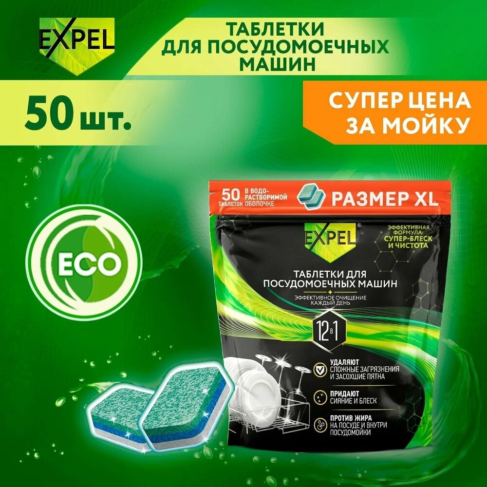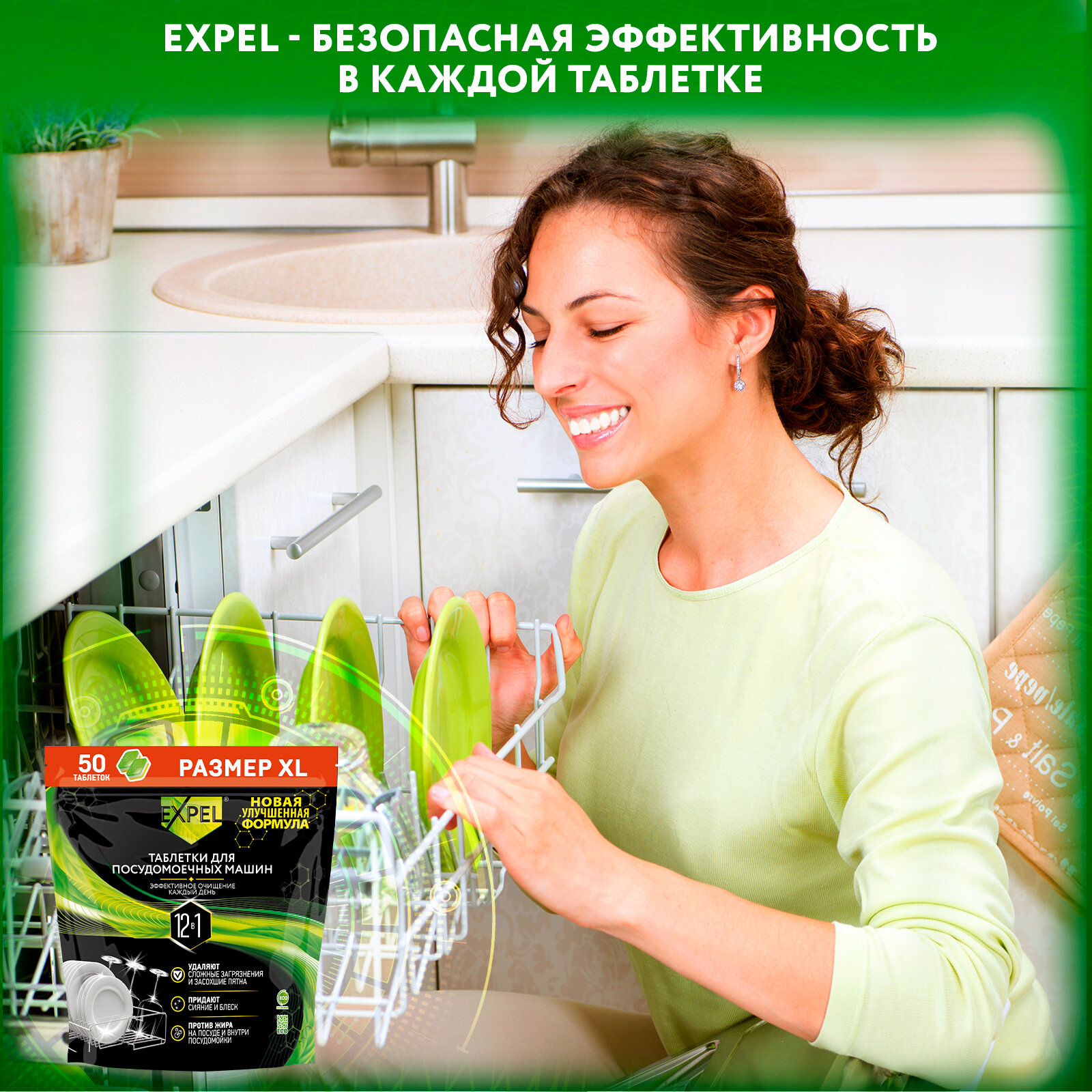 Таблетки для посудомоечной машины Expel, таблетки для ПММ 12 в 1 без запаха , 50 штук