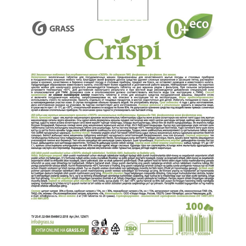 Таблетки для посудомоечных машин Grass CRISPI экологичные, 100 шт