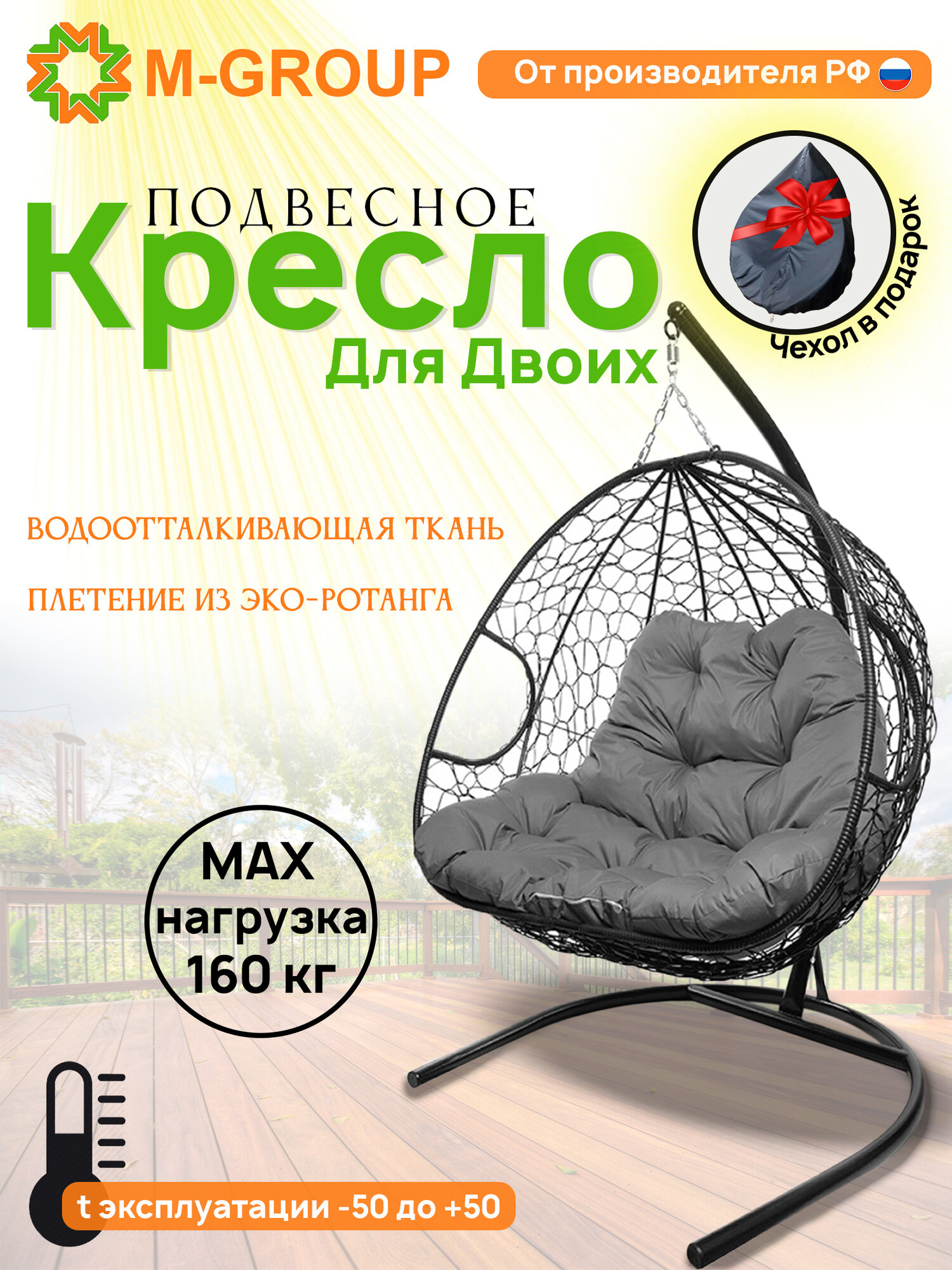Подвесное кресло с ротангом "Для двоих" черное с серой подушкой M-GROUP