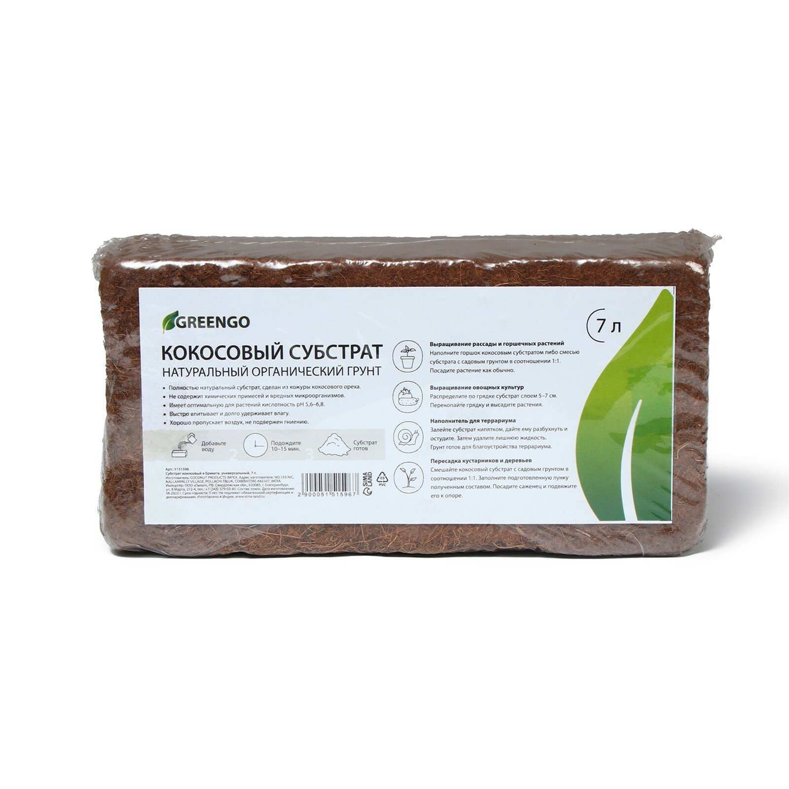 | Состав | Субстрат Greengo кокосовый, универсальный, натуральный грунт для террариумов и растений, в брикете, 7 л при разбухании |