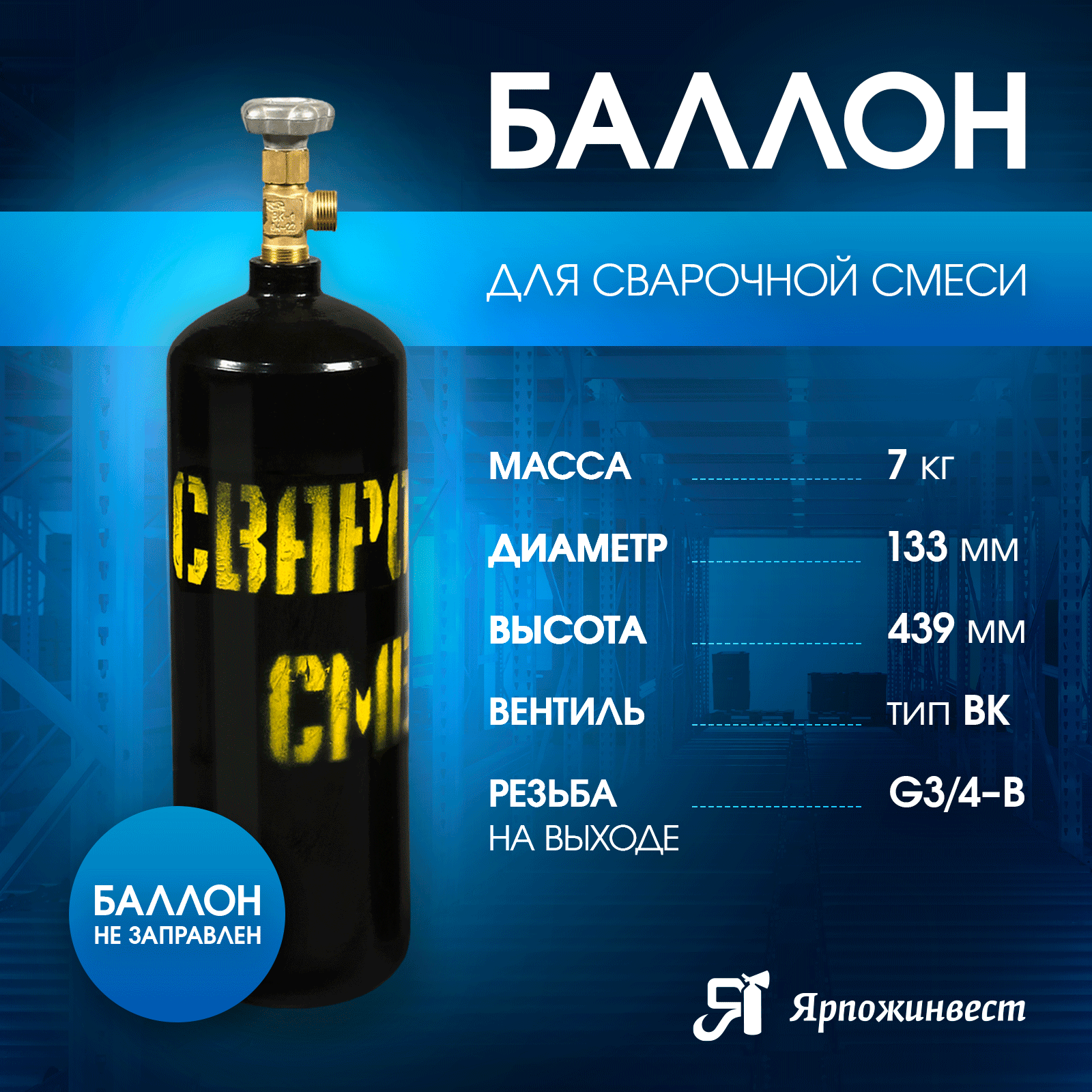 Баллон для газовой смеси (10 л; 133 мм; новый, пустой) Ярпожинвест 00000002599